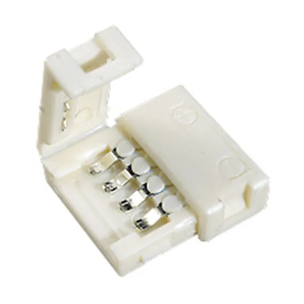 2-х сторонний разъем с фиксаторами для соединения 2-х отрезков светодиодных RGB лент шириной 10мм. Без провода. Материал - пластик. Максимальный допустимый ток 4А. Не рекомендуется соединять длинные отрезки лент!