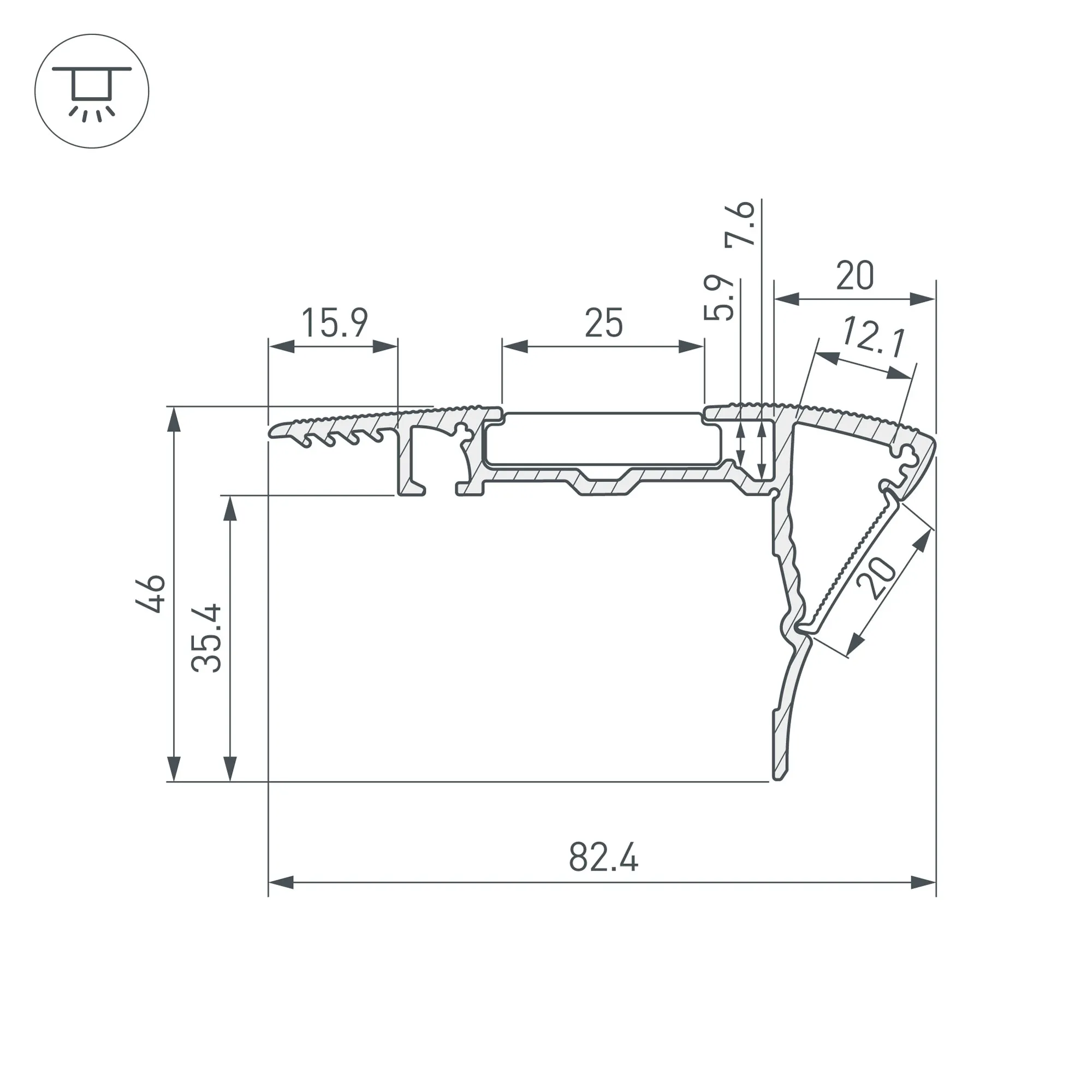 Поставка под заказ от 1 компл. Комплект с экраном. Алюминиевый профиль для ступеней, покрытых ковром. Подсветка вниз и вверх (опционально). В комплекте - матовый экран, акриловая ребристая сатинированная вставка (может заменяться на антискользящую резину). Габаритные размеры (L×W×H): 2000x82,4x46 мм. Ширина площадок для ленты 7,6 и 12,1 мм. Аксессуары приобретаются отдельно. Минимальный заказ 1 комплект.