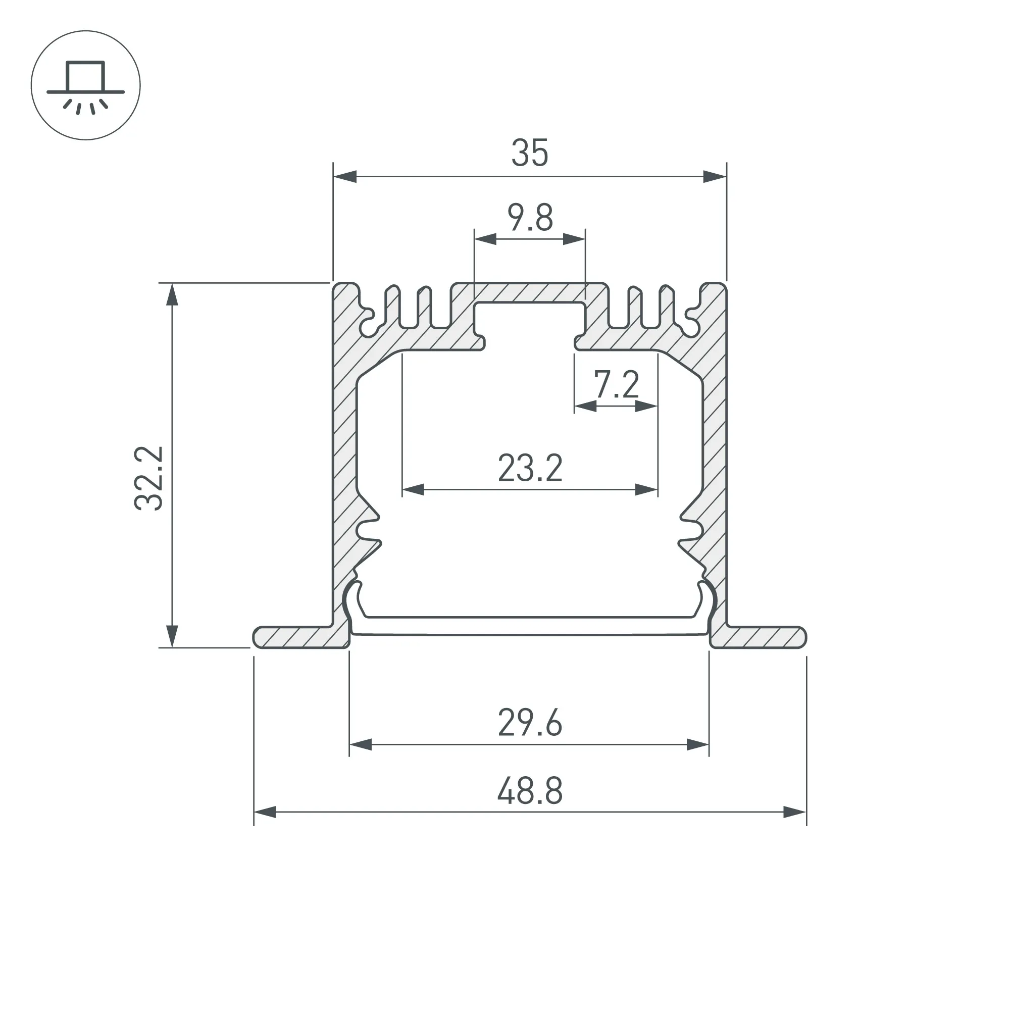 Алюминиевый анодированный профиль для светодиодных лент и линеек. Габаритные размеры (L×W×H): 2000x48,8x32,2 мм, паз для установки 35 мм. Ширина площадки для ленты 23 мм. Экраны, заглушки и другие аксессуары приобретаются отдельно. Цена за 1 метр.