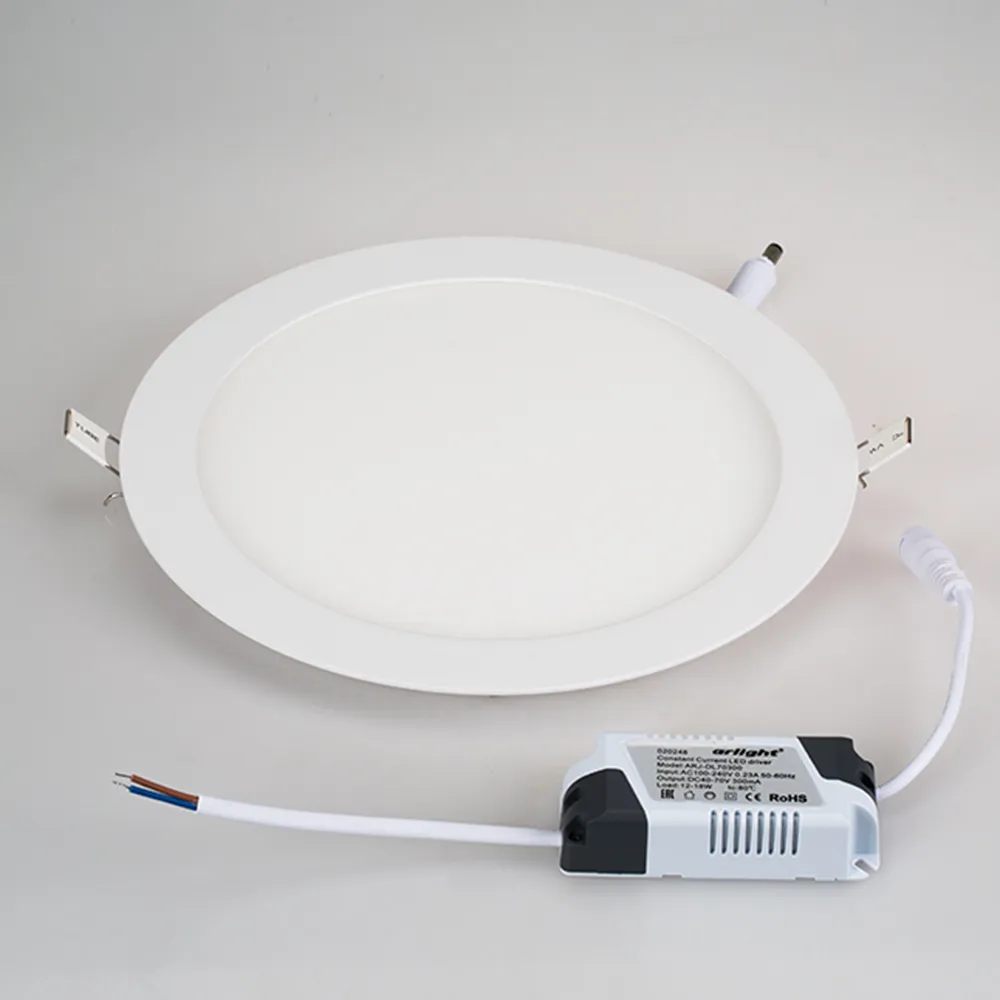 Тонкая панель 18Вт, белый круглый корпус. Цвет ДНЕВНОЙ БЕЛЫЙ 4000K, св.поток 1400лм, CRI(Ra)>80, угол 110°. Размер Ф225x13 мм, установка в отверстие 200 мм. Питание AC 100-240V, 18Вт, драйвер в комплекте (DC300mA, 40-70V).