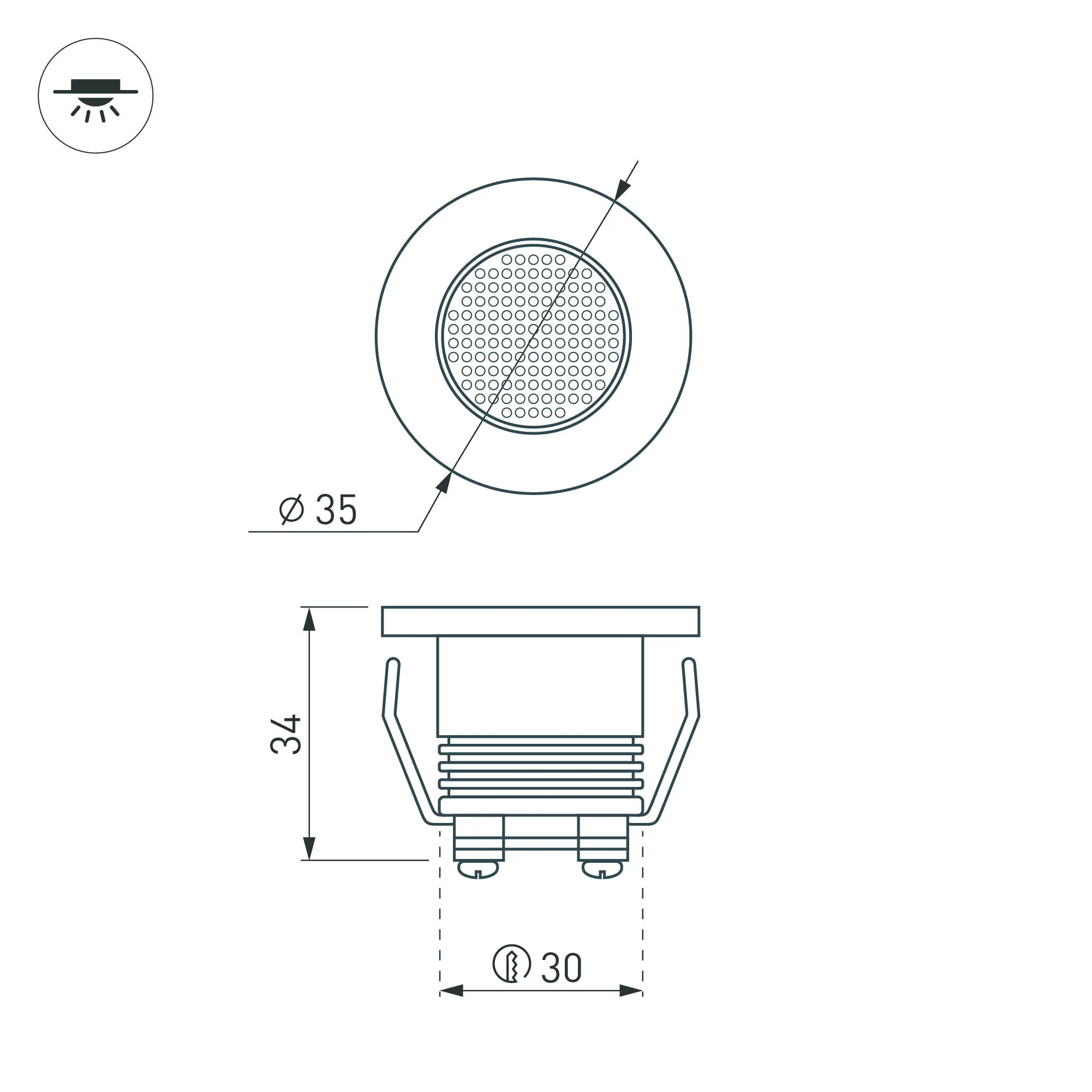 Врезной круглый мебельный светильник 1Вт, корпус белый алюминий. Цвет БЕЛЫЙ 6000K. Светодиод 1х1W OSRAM. CRI>80, Св.поток 80-90лм, угол 30°. Питание 180-240VAC, 1Вт, 150mA 6-7V, драйвер в комплекте. Размеры d35x34 мм, врезное отверстие d30 мм.