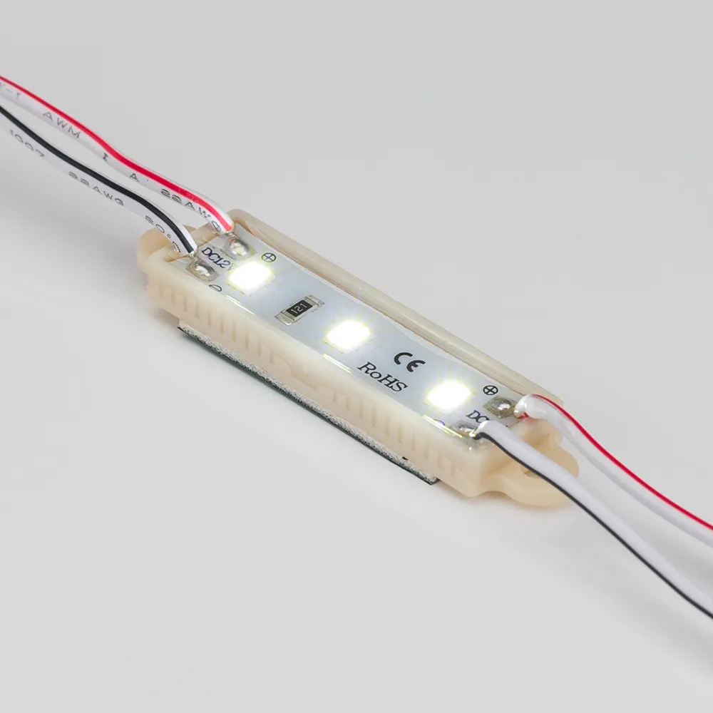 Светодиодный модуль 3шт smd 2835, цвет БЕЛЫЙ 6500-7000К, угол 120°. Световой поток 30 люмен. Питание 12В, мощность 0.33 Вт. Корпус IP65 ABS. Габариты ДхШхВ - 49x12x4 мм. На проводе 20шт. Расстояние между центрами 100 мм.