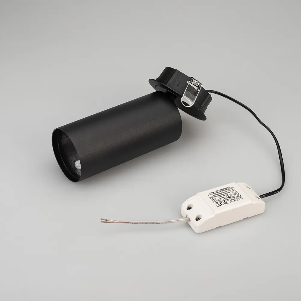 Корпус встраиваемый откидной для светильника POLO-R65 (1 часть из 3). Материал корпуса черный алюминий. Размер DxH Ø65x165мм, встроенный драйвер PRI:220-240VAC, SEC:DC 200mA 30-43V, 8Вт. Установка в отверстие Ø75мм.