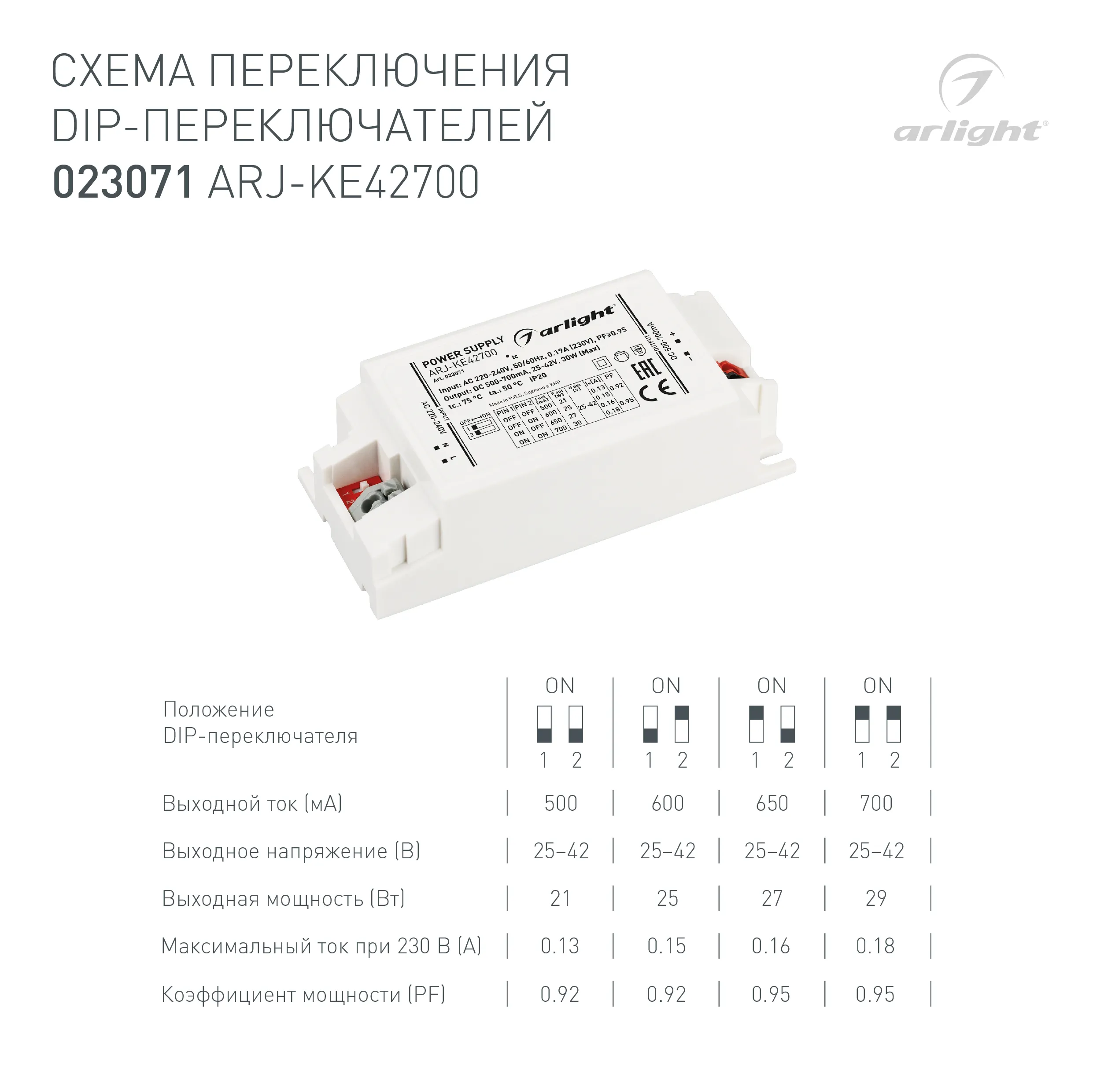 Блок питания ARJ-KE42700 (30W, 500-700mA, PFC) (Arlight, IP20 Пластик, 5 лет)