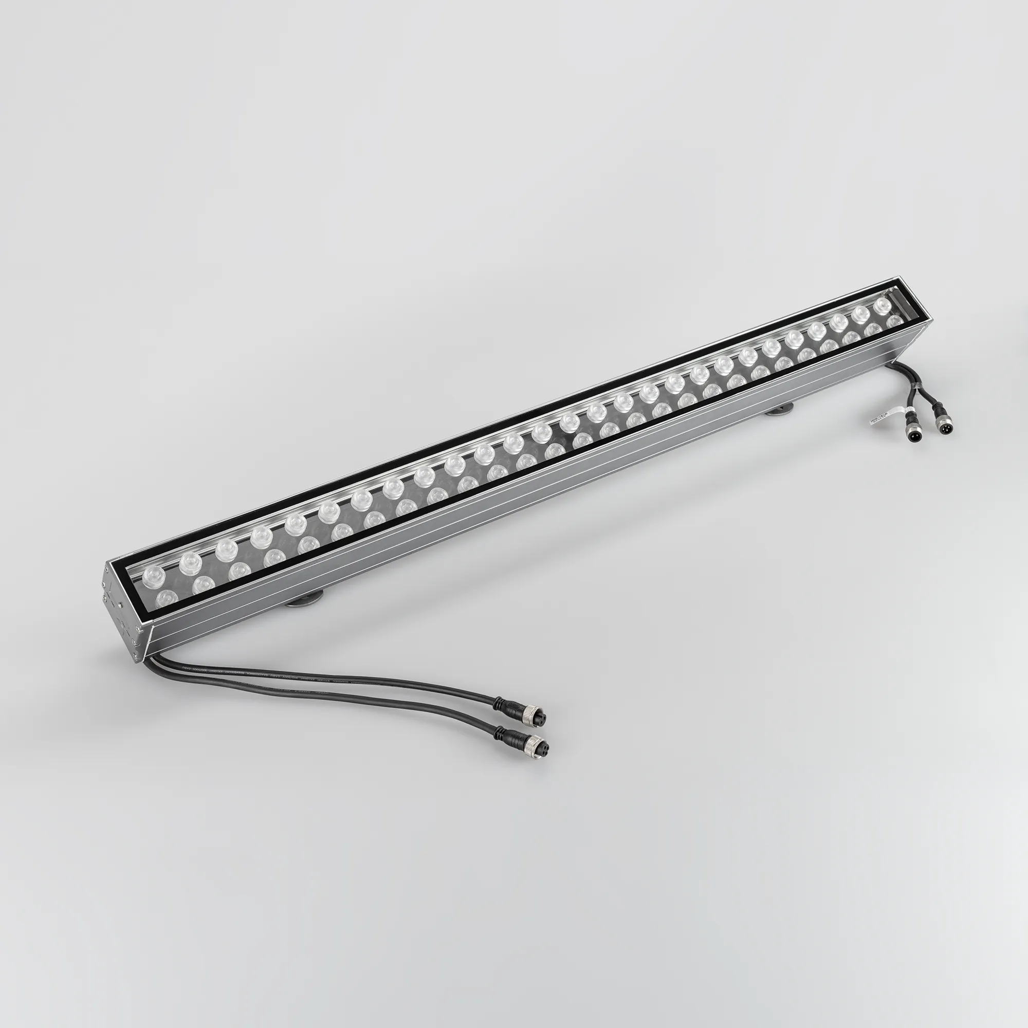 Линейный светодиодный прожектор. Мощность 54W, напряжение питания DC 24V. Светодиоды EPILED 54 штуки. Цвет светодиодов RGB, управление по протоколу DMX512, угол рассеивания 30°. Корпус: алюминиевый сплав и армированное стекло. Цвет корпуса серый, степень влагозащиты IP65. Габариты 1000x128x70мм.