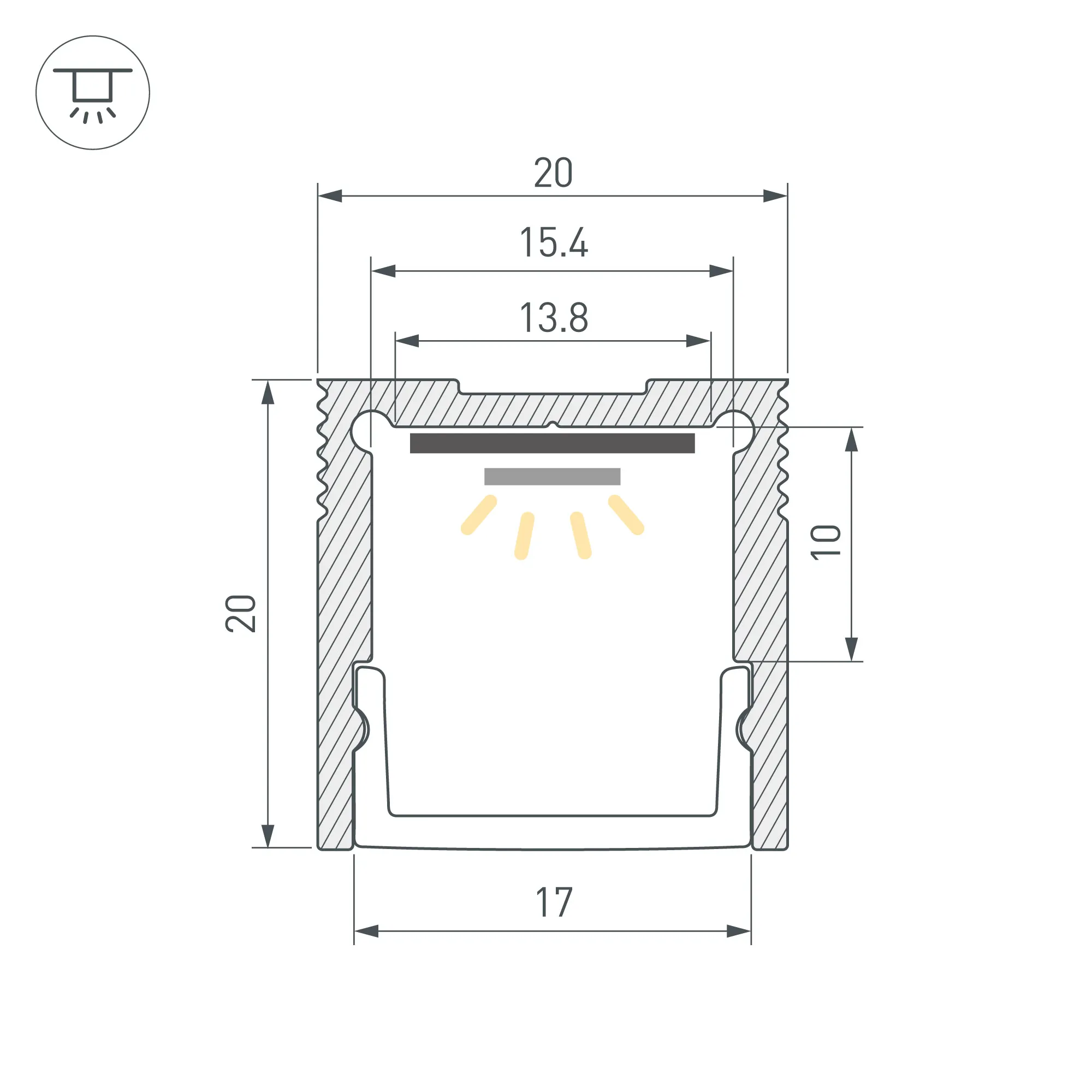 Алюминиевый анодированный профиль для светодиодных лент и линеек. Габаритные размеры (L×W×H): 2000x20x20 мм. Ширина площадки для ленты 15 мм. Экраны, заглушки и другие аксессуары приобретаются отдельно. Цена за 1 метр.