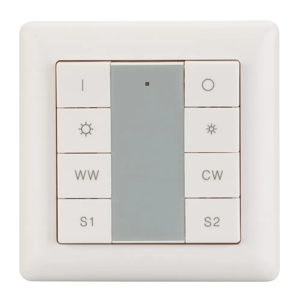 Настенная накладная пластиковая панель белого цвета с кнопочным управлением (8 кнопок управления) для светодиодных MIX-лент. 1 зона управления, 2 слота памяти пользовательских настроект. Питание по шине DALI. Система команд DT8, до 64 устройств при адресации 4 каналов (2CW+2WW) на 1 адрес.