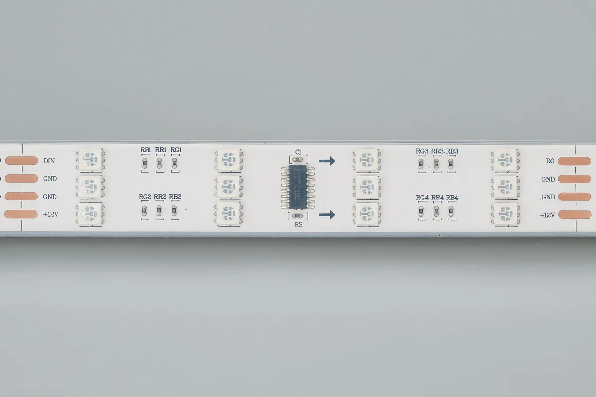 Гибкая трехрядная герметичная лента "Бегущие огни" с драйвером 1812, в силиконовой трубке (IP66), со СКОТЧЕМ 3M на обратной стороне. Длина 5м, 480шт LED RGB 5060, 32 pixel/m (1 pixel = 3 LED в одном столбце). Питание 12V, ном. мощн.12,8 Вт/м, макс. мощн-ть 16 Вт/м (статический белый цвет). Необходима подводка пит-я с 2 сторон ленты. Ширина 22 мм. Герметичные КРУГЛЫЕ коннекторы.
