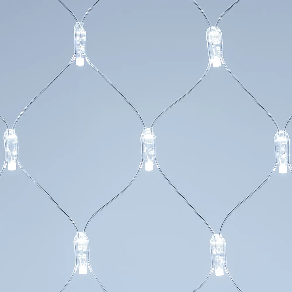 Светодиодная сеть Classic. 2000x1500 (длина 2000 мм, высота 1500 мм). Цвет свечения БЕЛЫЙ (6000 К). 288 светодиодов размером 7 мм со статическим и 8 динамическими эффектами свечения с резким световым рисунком (прозрачная вогнутая линза). Провод прозрачный, ПВХ. Питание 230 В, Мощность 18 Вт,защита IP65, применение в помещении и на улице под навесом Аксессуары для подключения и выбора режима свечения в комплекте.