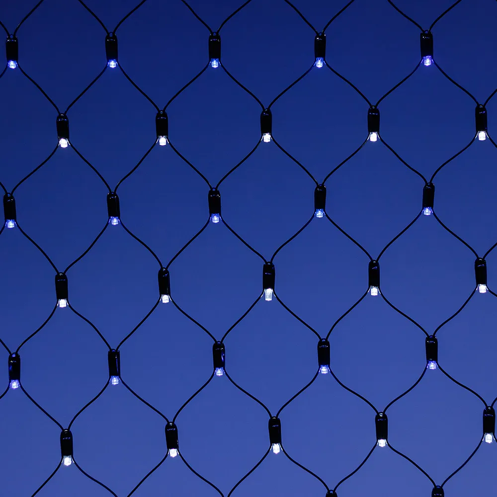 Светодиодная сеть Classic. 2000x1500 (длина 2000 мм, высота 1500 мм). Цвет свечения СИНИЙ. 288 светодиодов размером 7 мм со статическим и 8 динамическими эффектами свечения с резким световым рисунком (прозрачная вогнутая линза). Провод черный, ПВХ. Питание 230 В, Мощность 18 Вт,защита IP65, применение в помещении и на улице под навесом Аксессуары для подключения и выбора режима свечения в комплекте.