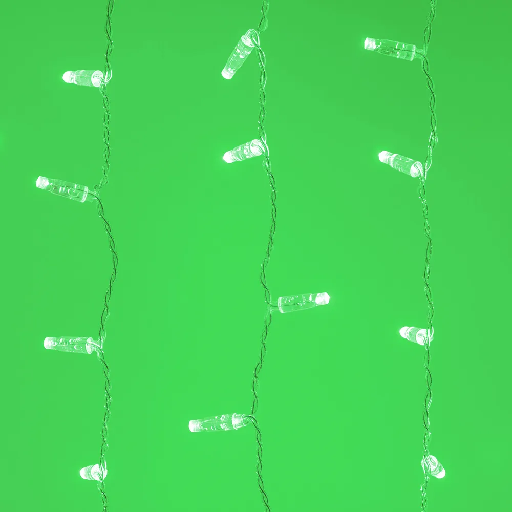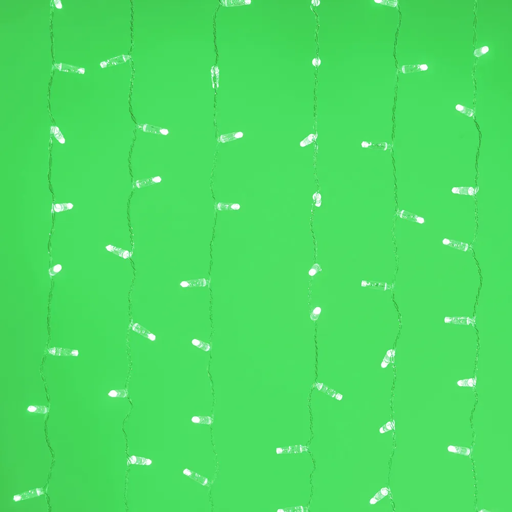 Светодиодный Занавес Classic. Размер 2000x1500 мм (длина 2000 мм, высота 1500 мм). 20 ниспадающих нитей длиной 1500 мм. 360 светодиода размером 7 мм. Цвет свечения ЗЕЛЕНЫЙ, постоянное свечение и 8 динамических эффектов с резким световым рисунком (прозрачная вогнутая линза). Провод прозрачный, ПВХ. Питание 230 В, Мощность 60 Вт, защита IP65, применение в помещении и на улице под навесом. Аксессуар для подключения и выбора режима свечения в комплекте.