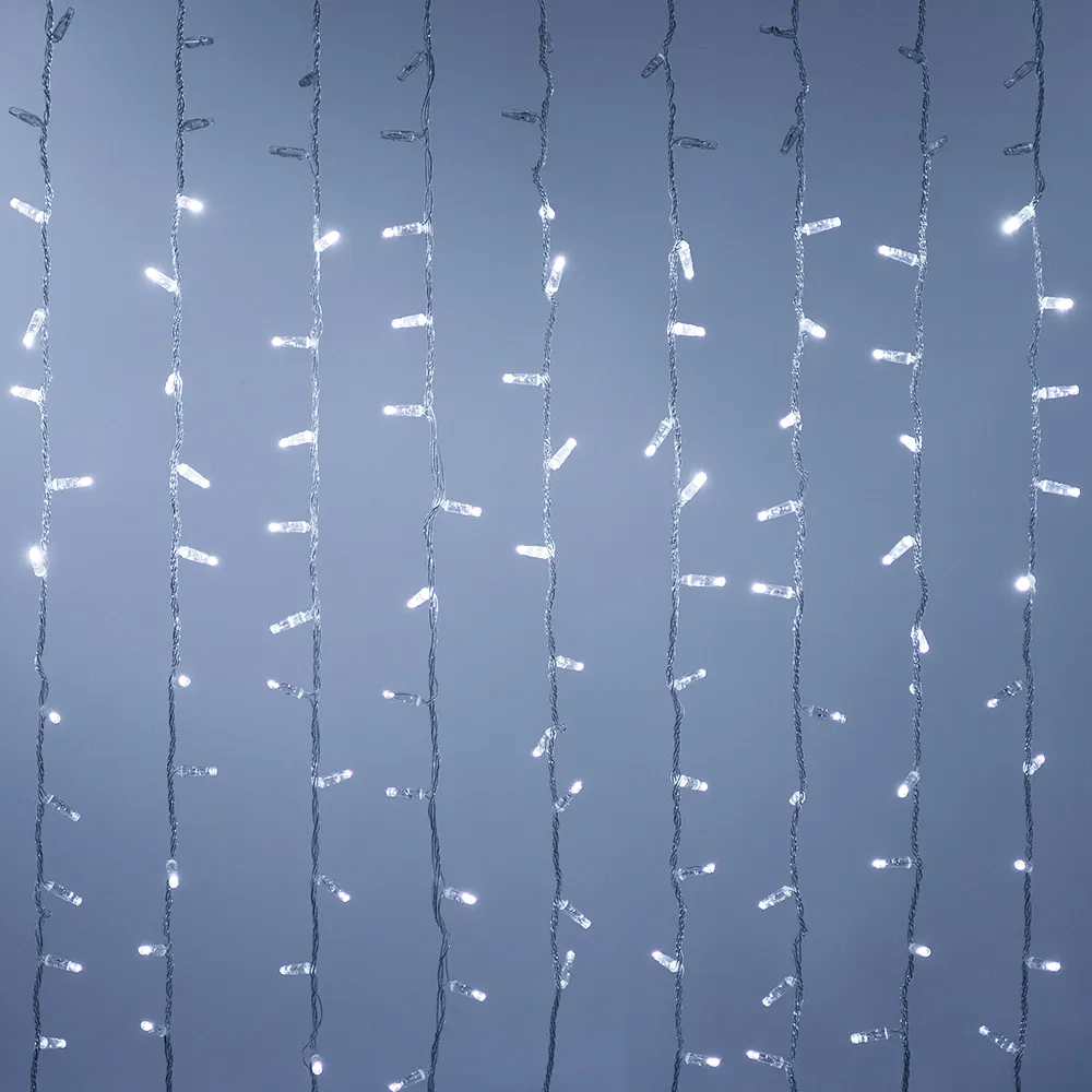 Светодиодный занавес Classic. Размер 2000x9000 мм (длина 2000 мм, высота 9000 мм). 20 ниспадающих нитей длиной 9000 мм. Цвет светодиодов БЕЛЫЙ (6000 К), динамический эффект "водопад". 2200 светодиодов размером 7 мм с резким световым рисунком (прозрачная вогнутая линза). Провод прозрачный, ПВХ. Питание 230 В, Мощность 180 Вт, защита IP65, применение в помещении и на улице под навесом. Аксессуары для подключения в комплекте.