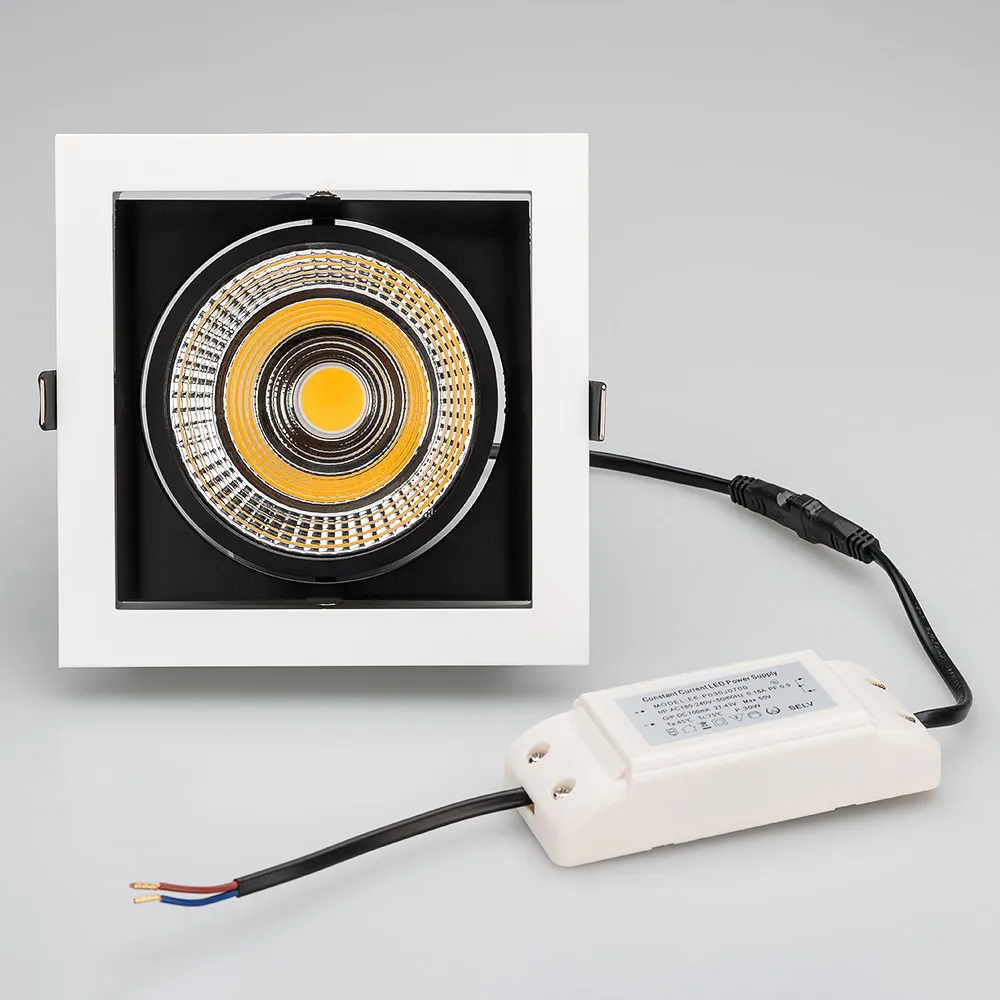 Поставка под заказ от 100 штук. Встраиваемый карданный светильник. Угол 30° / 25Вт / ТЕПЛЫЙ БЕЛЫЙ 3000K / 2200лм, CRI>90. Корпус из белого алюминия с черными вставками. Питание AC220-240V, 25Вт, 700mA 30-42V, драйвер в комплекте. Размеры LxWxH: 152х152x95мм, отверстие для установки 140x140мм.
