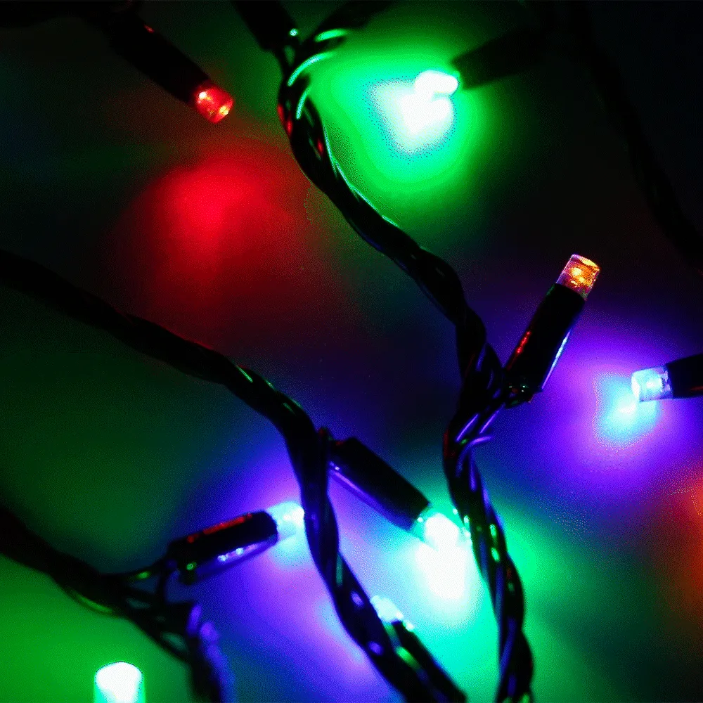 Светодиодная нить Classic. Размер 10000 мм. Цвет свечения RGBY, 100 светодиодов размером 7 мм с динамическими и статическими эффектами свечения с резким световым рисунком (прозрачная вогнутая линза). Смена эффектов и управление осуществляется с помощью контроллера с кнопкой. Провод черный, ПВХ. Питание 230 В, Мощность 7 Вт, защита IP65, применение в помещении и на улице под навесом. Аксессуары для подключения и управления приобретаются отдельно.