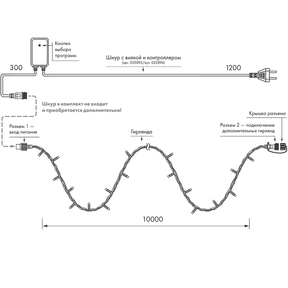 Светодиодная нить Pro. Размер 10000 мм. Цвет свечения RGBY, 100 светодиодов размером 7 мм с динамическими и статическими эффектами свечения с резким световым рисунком (прозрачная вогнутая линза). Смена эффектов и управление осуществляется с помощью контроллера с кнопкой. Провод белый, каучук. Питание 230 В, Мощность 7 Вт, защита IP65, применение в помещении и на улице под навесом. Аксессуары для подключения и управления приобретаются отдельно.