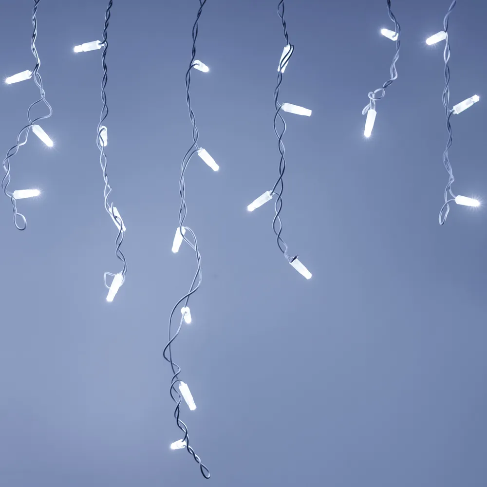 Светодиодная бахрома Pro. Размер 4000x600 мм (длина 4000 мм, по длине 32 нити высотой 200/600 мм). Количество светодиодов 128 шт размером 7 мм. Цвет свечения БЕЛЫЙ (6000 К), эффект постоянного свечения с резким световым рисунком (прозрачная вогнутая линза). Провод белый, резиновый. Питание 230 В, Мощность 8 Вт, защита IP65, применение на улице под навесом. Аксессуары для подключения приобретаются отдельно.