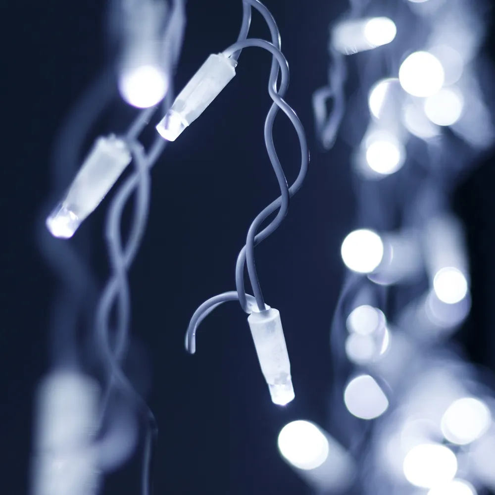 Светодиодная бахрома Pro. Размер 5600x900 мм (длина 5600 мм, по длине 48 нитей высотой 200/900 мм). Количество светодиодов 240 шт размером 7 мм. Цвет свечения БЕЛЫЙ (6000 К), эффект постоянного свечения с резким световым рисунком (прозрачная вогнутая линза). Провод белый, резиновый. Питание 230 В, Мощность 15 Вт, защита IP65, применение на улице под навесом. Аксессуары для подключения приобретаются отдельно.