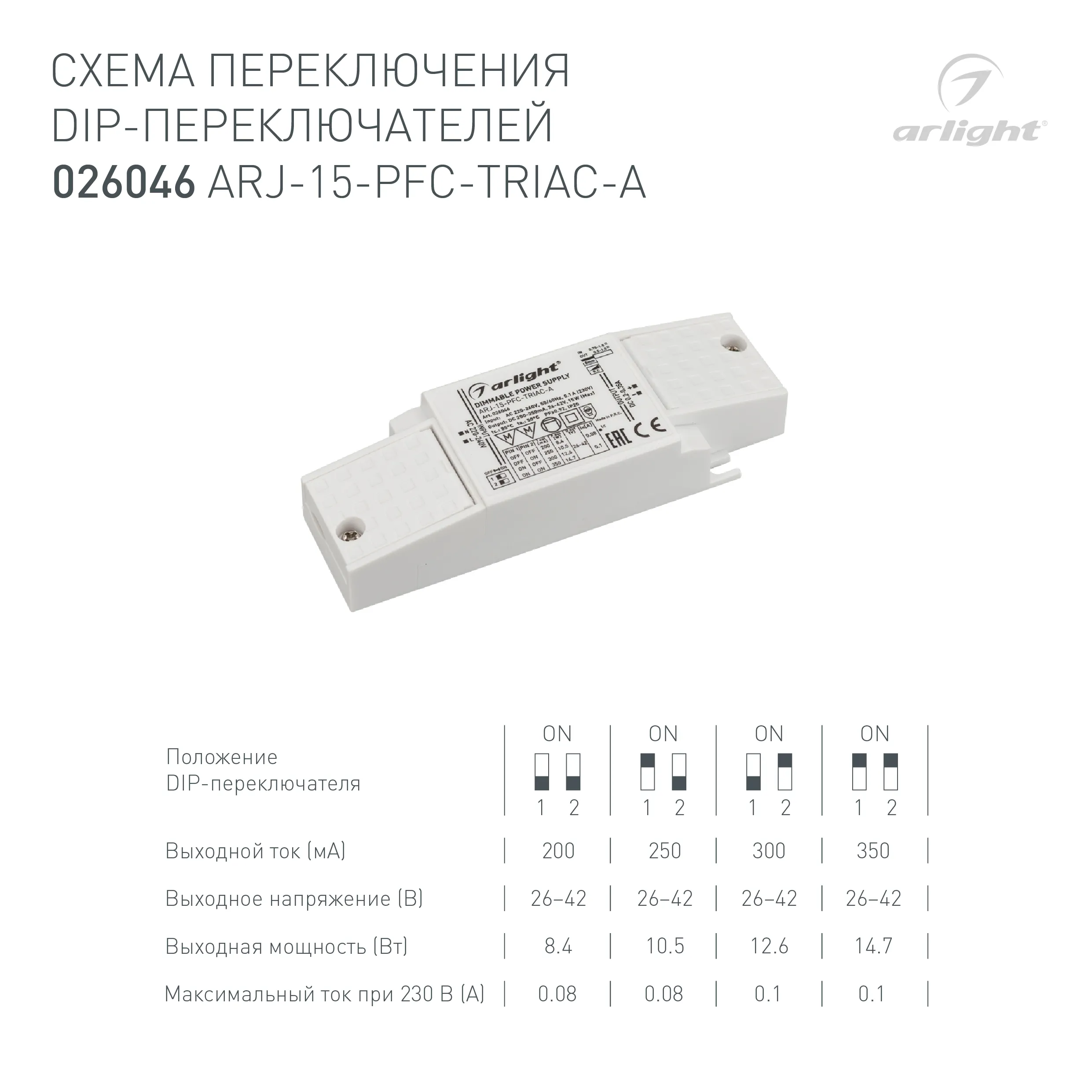 Блок питания ARJ-15-PFC-TRIAC-A (15W, 200-350mA) (Arlight, IP20 Пластик, 5 лет)