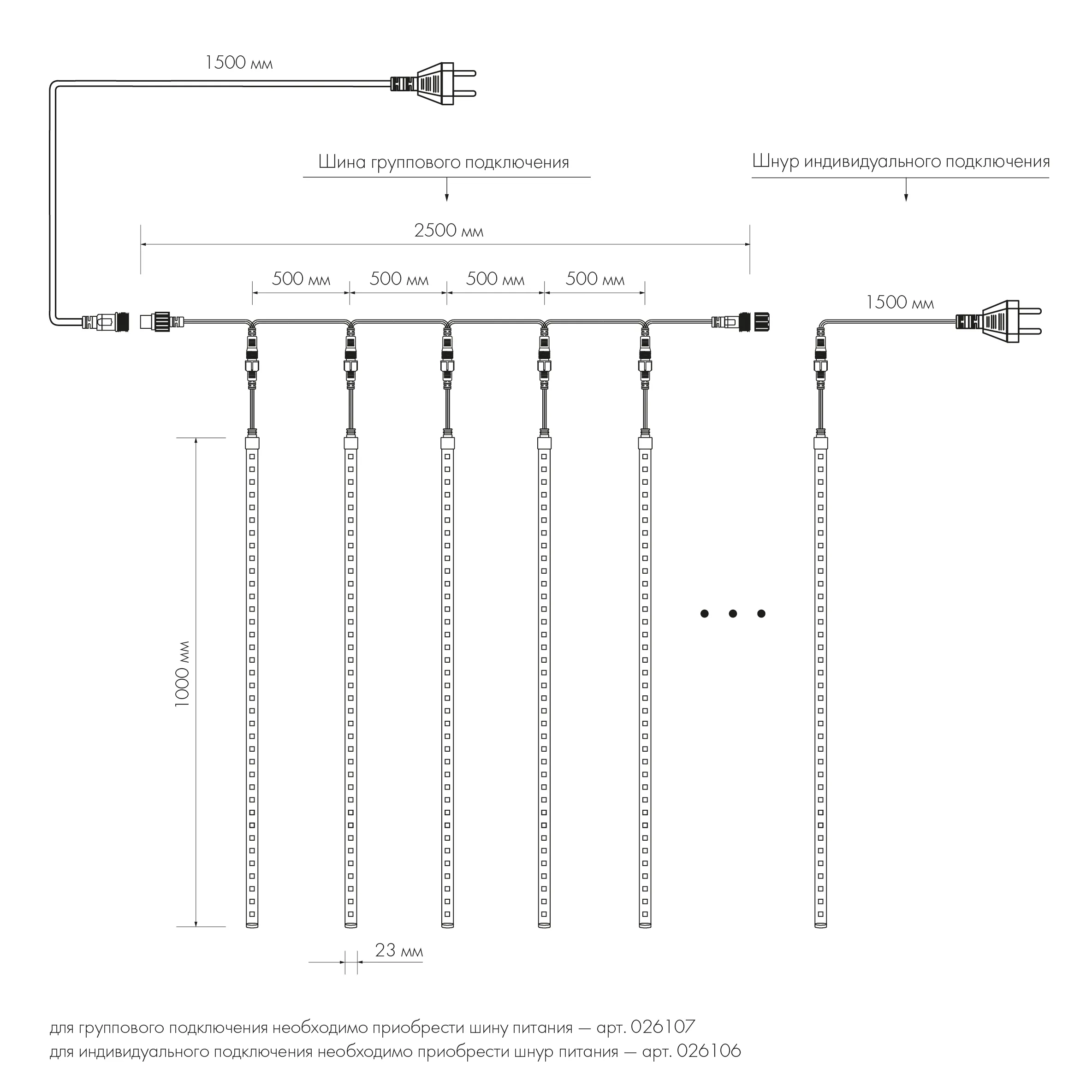Светодиодные Тающие сосульки Classic. Размер 1000x23 мм (длина шины 1000 мм, диаметр колбы 23 мм). Цвет светодиодов БЕЛЫЙ (6000 К), динамический эффект "тающая сосулька". 96 светодиодов. В комплекте 1 сосулька. Провод прозрачный, ПВХ. Питание 230 В, Мощность 1,5 Вт, защита IP65, применение в помещении и на улице под навесом. Для эксплуатации необходимо приобрести аксессуар для подключения.