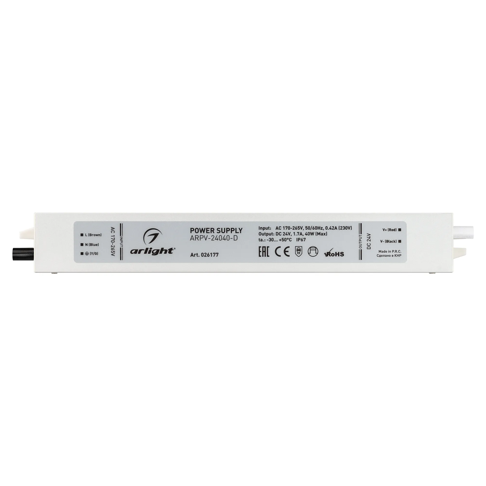 Источник напряжения с гальванической развязкой для светодиодных изделий. Входное напряжение 170-265 VAC. Выходные параметры: 24 В, 1,7 А, 40 Вт. Герметичный алюминиевый корпус IP 67. Рабочая температура -30…+50C⁰. Габаритные размеры длина 217 мм, ширина 30 мм, высота 20 мм. Гарантийный срок 3 года.