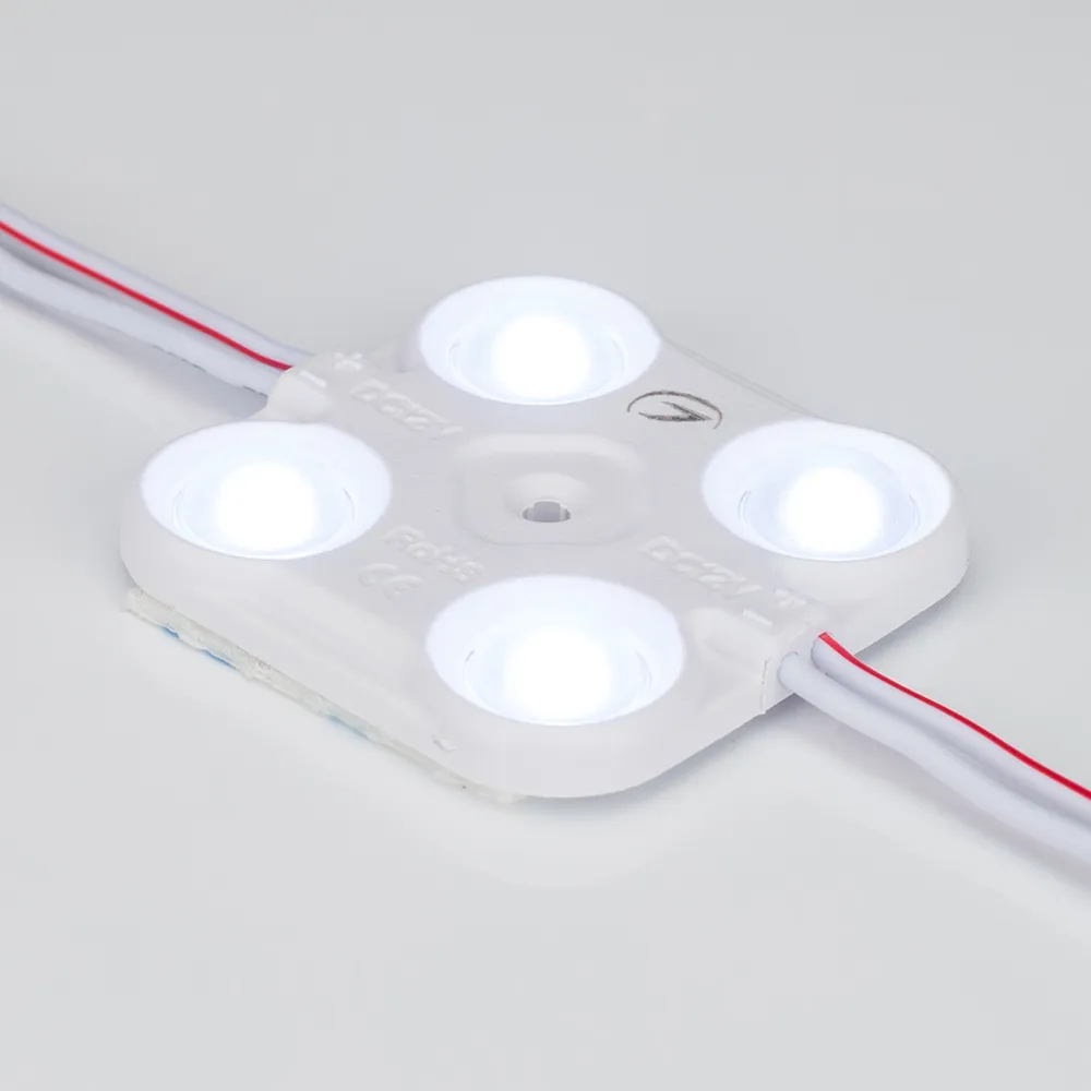 Светодиодный модуль, 4 светодиода smd 2835, Герметичный корпус IP 67, Пластик ABS, Цвет Холодный белый 8000-10000К, Световой поток 180 лм, Угол 160°, На проводе 30 шт, Длина провода 159мм, расстояние между центрами модулей 216мм, Рекомендуемая глубина установки 150-300мм, Питание 12В, мощность 2 Вт, Габариты ДxШxВ: 41х41x5.9мм, IP 67 Технология Constant Current