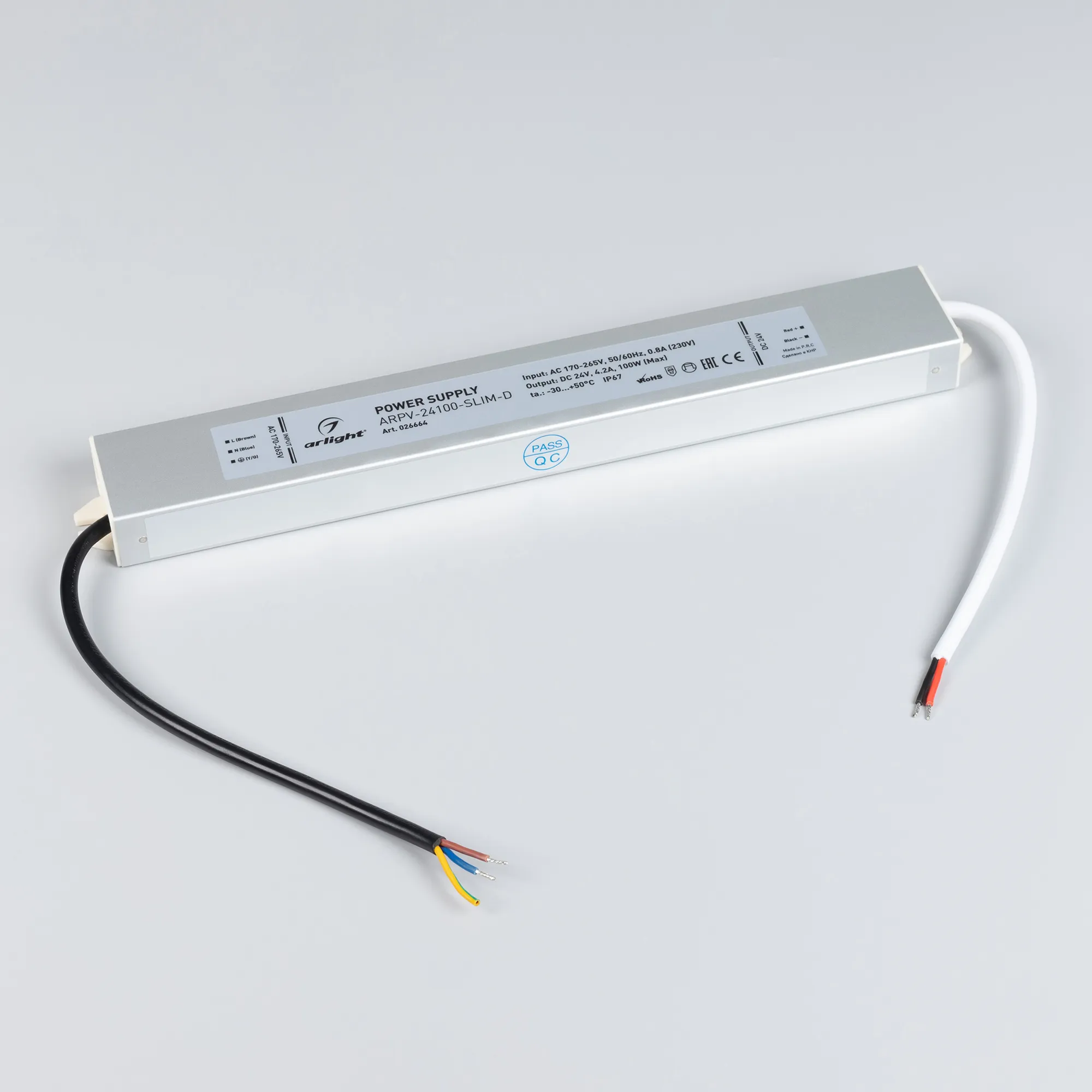 Источник напряжения с гальванической развязкой для светодиодных изделий. Входное напряжение 170-265 VAC. Выходные параметры: 24 В, 4.2 А, 100 Вт. Герметичный алюминиевый корпус IP 67. Рабочая температура -30…+50C⁰. Габаритные размеры длина 303 мм, ширина 40 мм, высота 22 мм. Гарантийный срок 3 года.