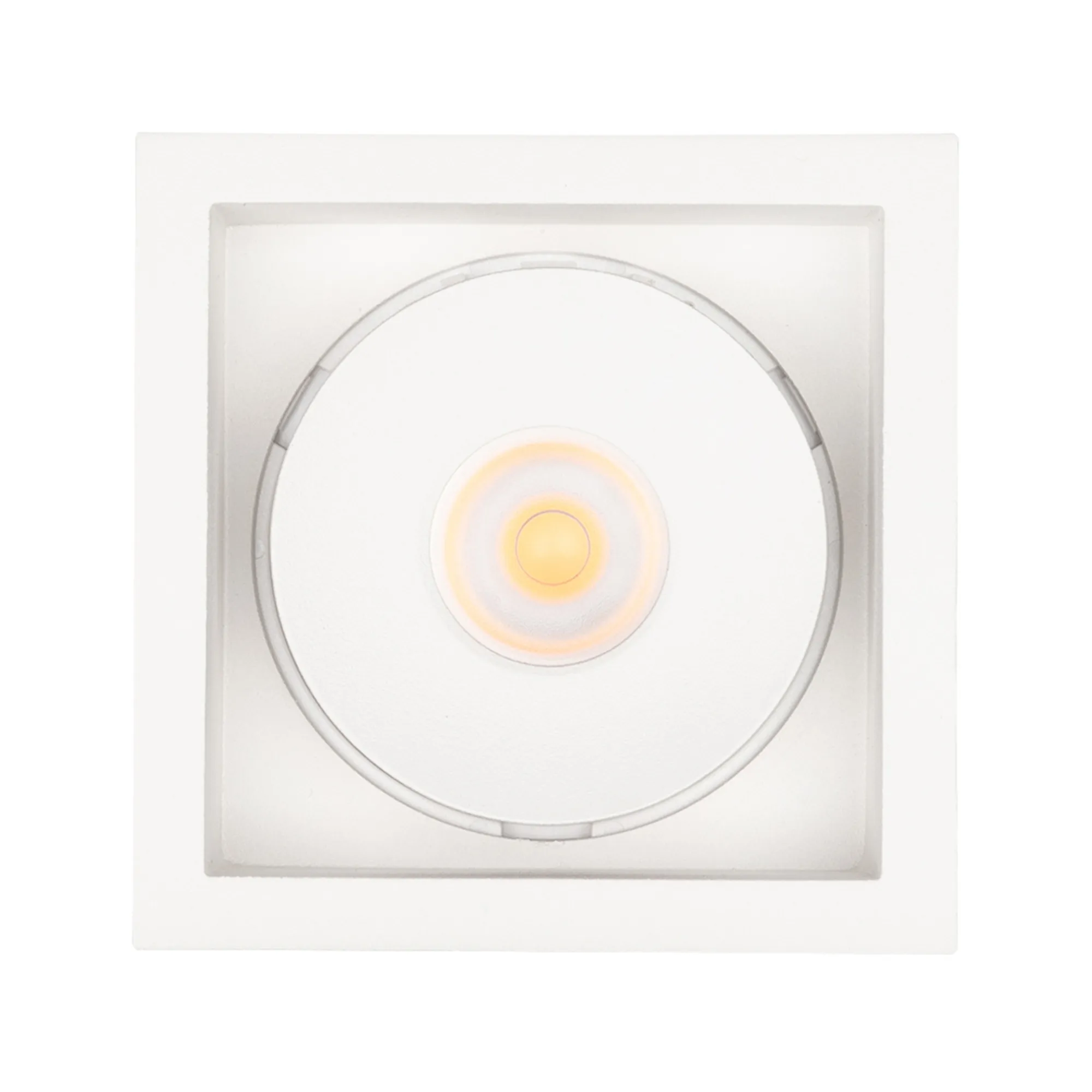 Встраиваемый поворотный светильник для потолка. Мощность 9W, цвет ТЕПЛЫЙ 3000K, св.поток 630лм, угол 45°, RA>90. Корпус квадратный белый. Питание AC180-240V. Размеры LxWxH 80x80x90мм. Установка в отверстие 70x70мм. Драйвер в комплекте (30-45V, 220mA).