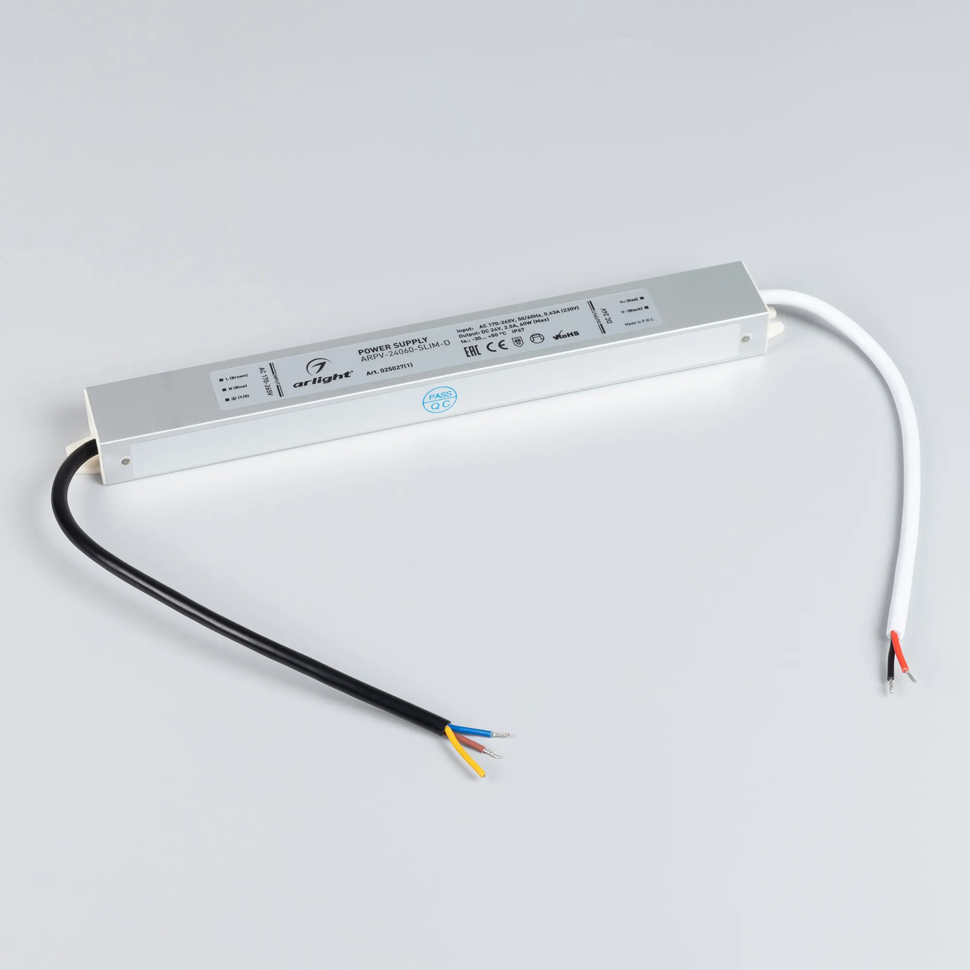 Источник напряжения с гальванической развязкой для светодиодных изделий. Входное напряжение 170-265 VAC. Выходные параметры: 24 В, 2,5 А, 60 Вт. Герметичный алюминиевый корпус IP 67. Рабочая температура -30…+50C⁰. Габаритные размеры длина 257 мм, ширина 30 мм, высота 20 мм. Гарантийный срок 3 года.