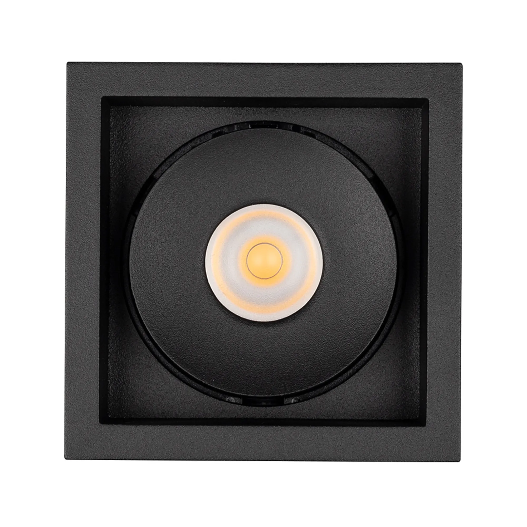 Встраиваемый поворотный светильник для потолка. Мощность 9W, цвет ТЕПЛЫЙ 3000K, св.поток 630лм, угол 45°, RA>90. Корпус квадратный черный. Питание AC230V. Размеры LxWxH 80x80x90мм. Установка в отверстие 70x70мм. Драйвер в комплекте (30-45V, 220mA).