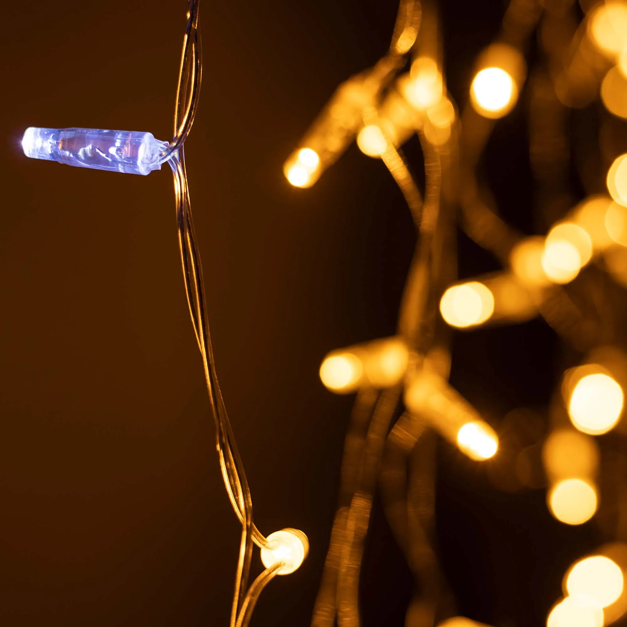Светодиодная бахрома Classic. Размер 2400 мм (длина 2400 мм, по длине 24 нити высотой 200/600 мм). Количество светодиодов 88 шт размером 7 мм. Основной цвет свечения ЖЕЛТЫЙ, эффект мерцания редких точек (БЕЛЫЙ 6000К) с резким световым рисунком (прозрачная вогнутая линза), соотношение светодиодов: 66 желтых постоянного свечения / 12 белых с мерцанием. Эффект частого мерцания. Провод прозрачный, ПВХ. Питание 230 В, Мощность 6 Вт, защита IP65, применение на улице под навесом. Аксессуары для подключения приобретаются отдельно.
