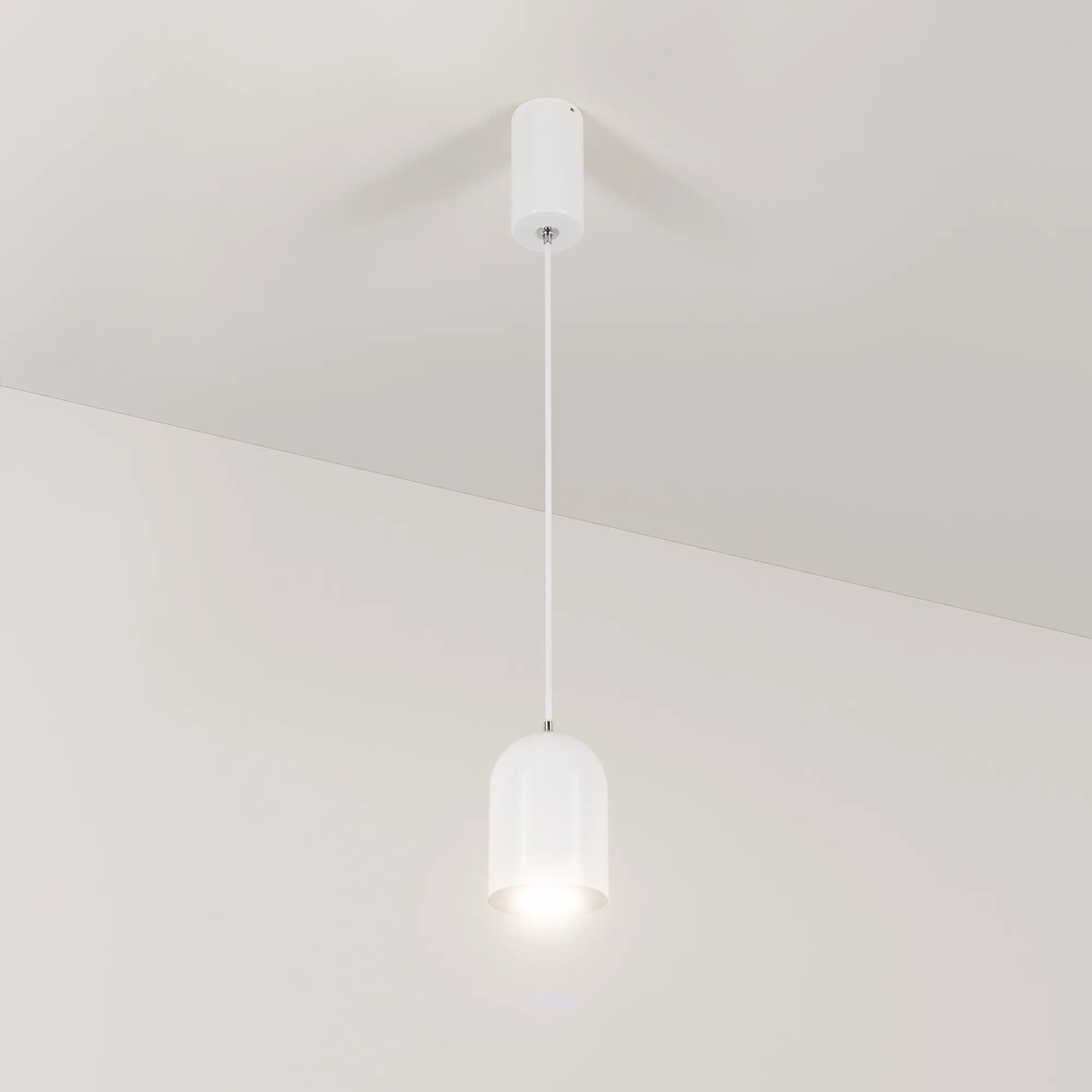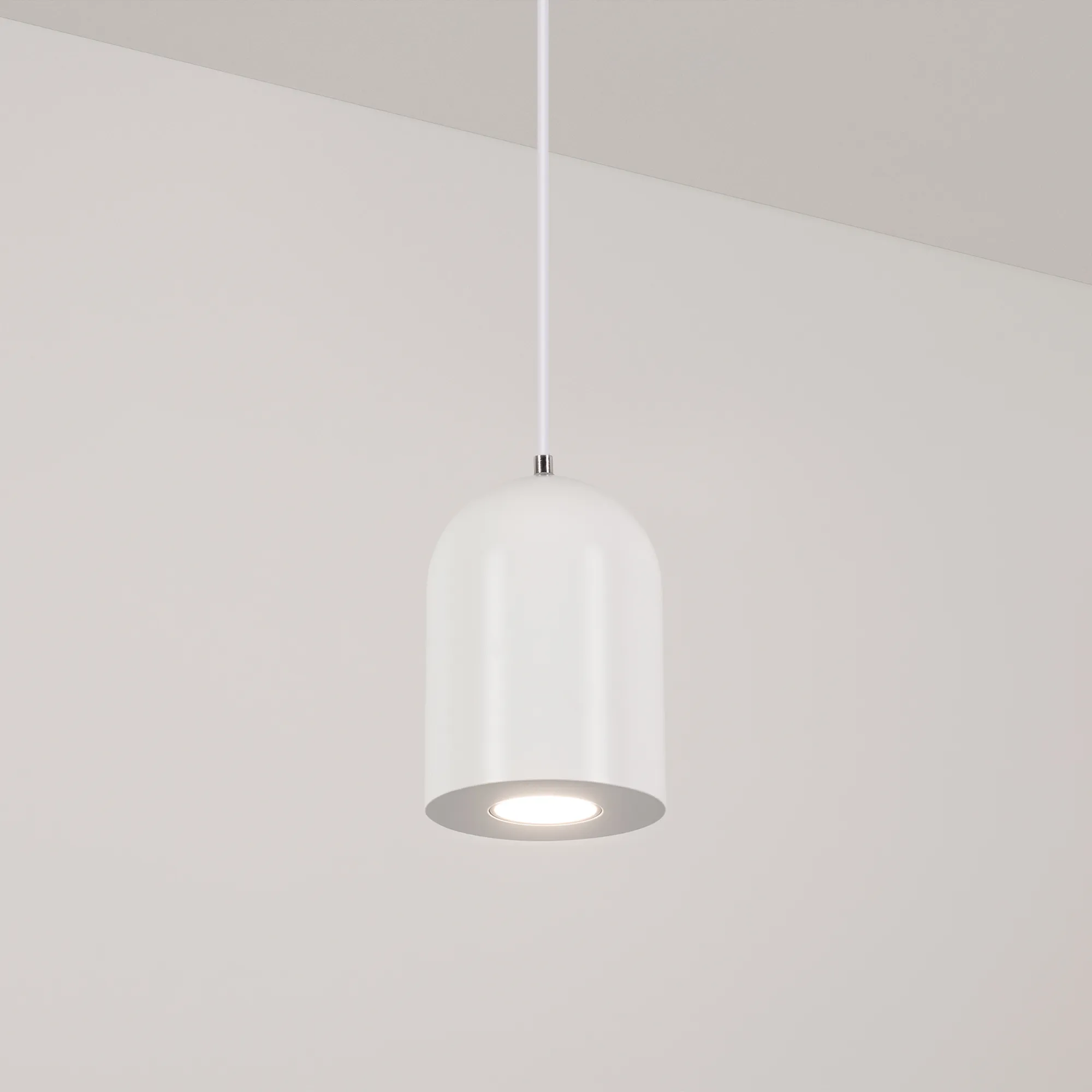 Подвесной светильник. Мощность 9 Вт, св. поток 650 лм, 73 лм/Вт, дневной 4000 K, CRI>80, угол 39°, напряжение питания 230 В. Белый корпус из алюминия, экран , степень защиты IP40. Размер: диаметр 71 мм, высота 100 мм. Монтаж подвесной, длина подвеса 1500мм, регулируемая. Габариты чаши Ø50x95 мм. Драйвер 28-42 В, 250 мА, пульсация <5%.