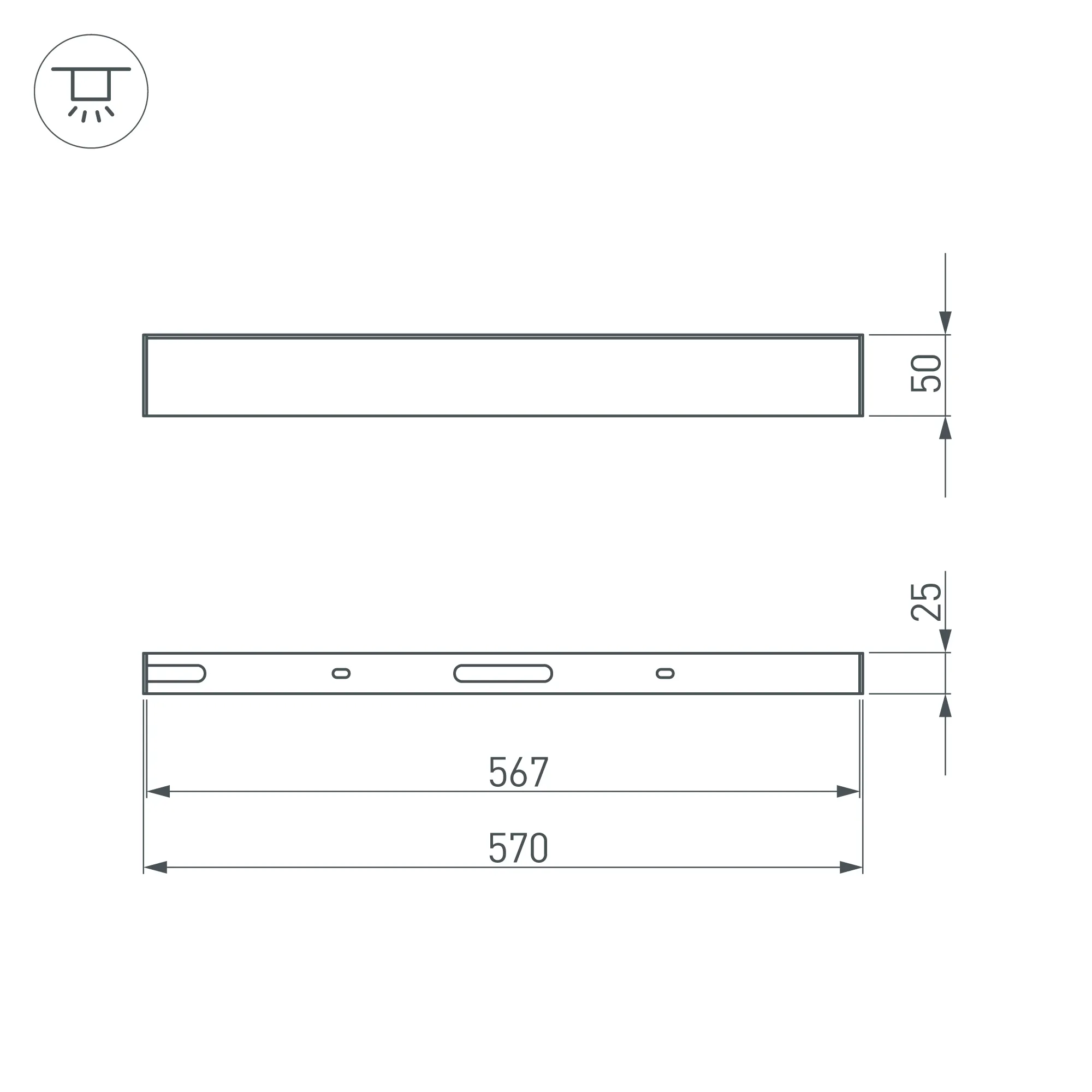 Внутренние размеры: 567×22×37,5 мм. Внешние размеры: 570×25×50мм.