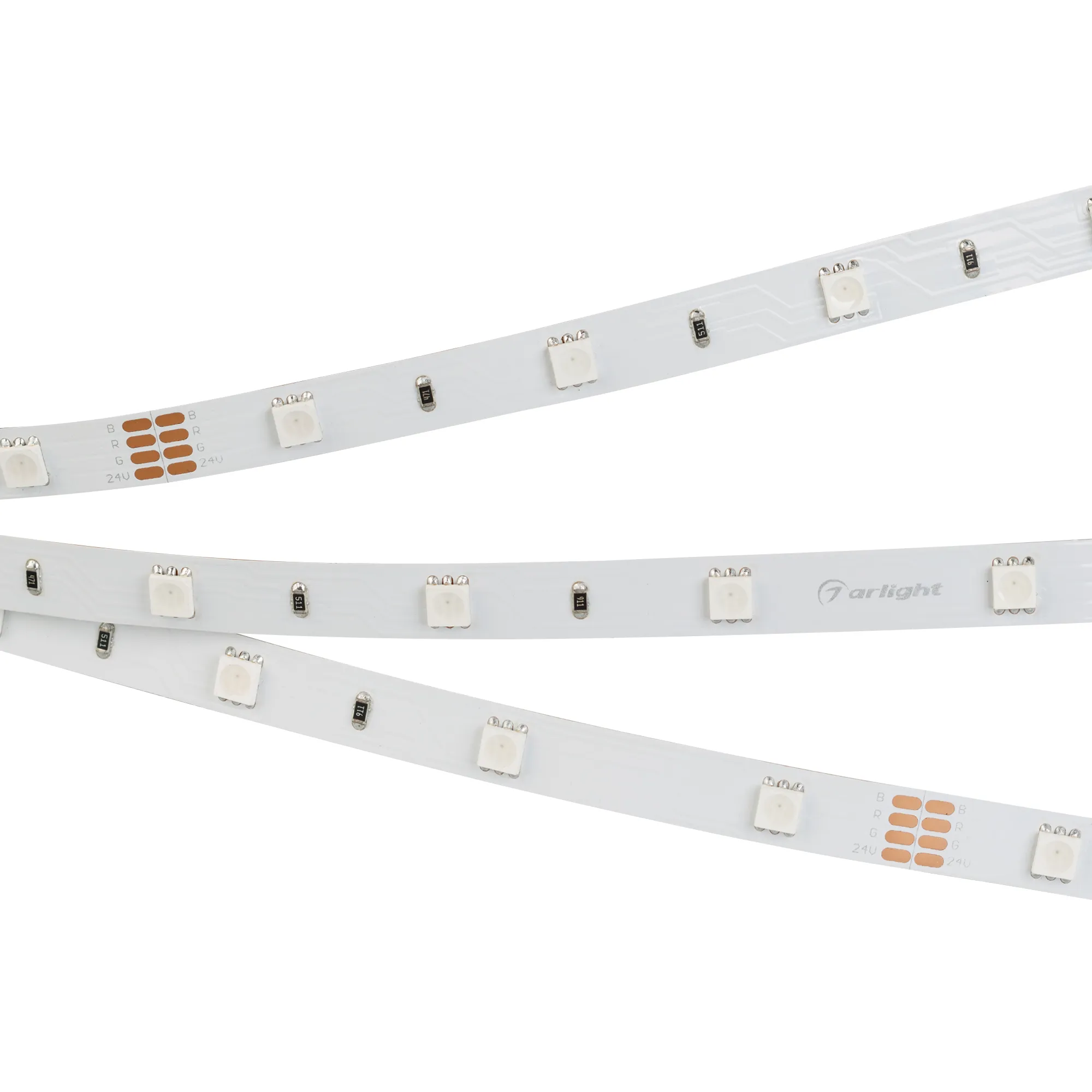 Мультицветная светодиодная лента RT серии B30. Светодиоды SMD 5060, 30 шт/м, белая плата шириной 10 мм, скотч 3M. Цвет RGB, угол 120°. Питание 24 В, мощность 7.2 Вт/м (36 Вт на 5 м). Размеры 5000x10x2.2 мм. Мин. отрезок 166.67 мм , 5 светодиодов. Цена за 1 м.