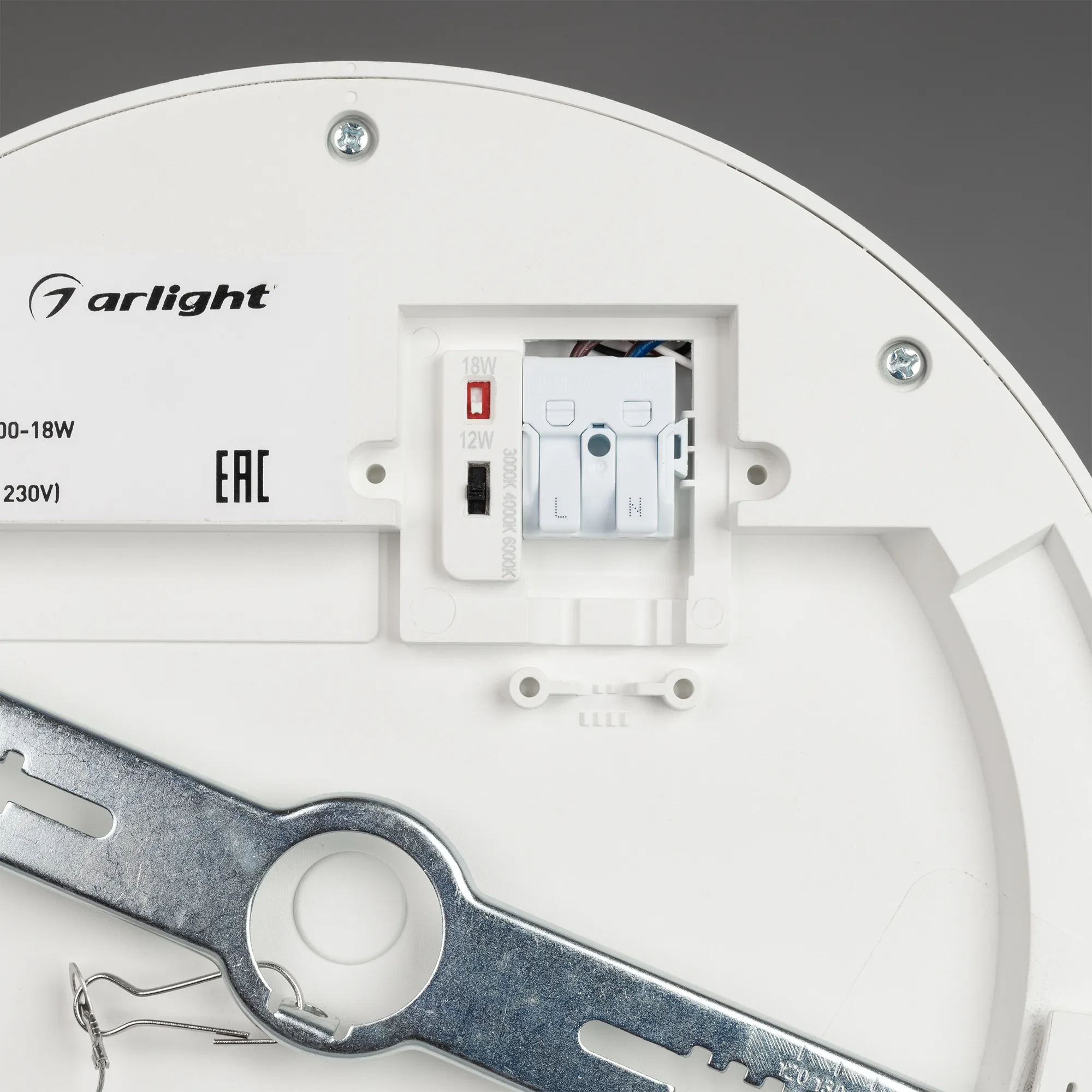 Накладной/встраиваемый светильник с изменяемой мощностью и цветовой температурой. Мощность 12-18 Вт, св. поток 1000-1700 лм, 75-90 лм/Вт, теплый 3000 K, дневной 4000K, белый 6000K, CRI>80, угол 120°, напряжение питания 230 В. Белый круглый корпус из пластика, экран поликарбонат, степень защиты IP44. Размер: диаметр 220 мм, высота 21,5 мм. Монтаж накладной/встраиваемый, установочное отверстие: диаметр 120-200 мм (регулируемое). Драйвер встроенный, пульсация <1%. Комплект крепежа для встраиваемого монтажа поставляется отдельно.