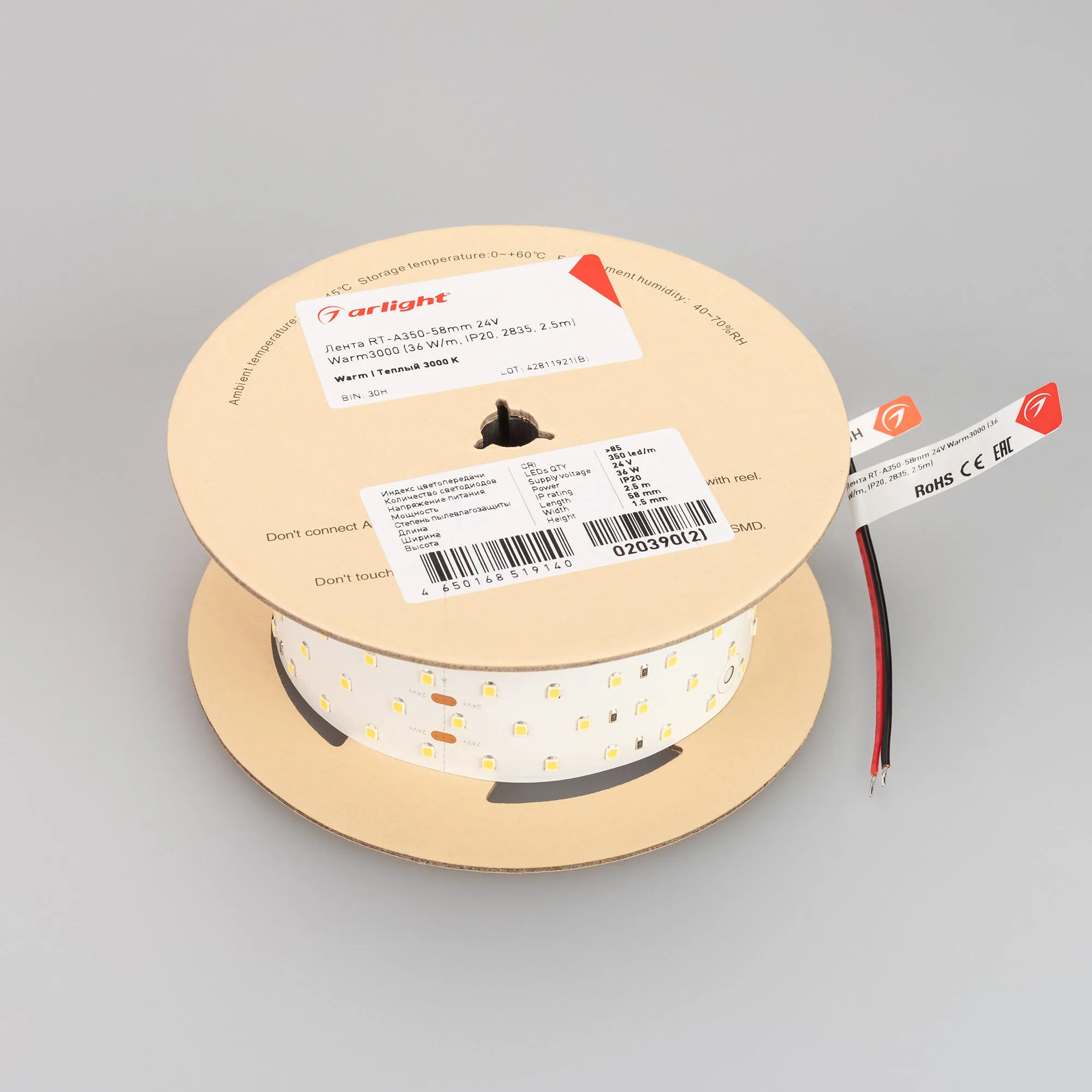 Лента светодиодная RT-A350-58mm 24V Warm3000 (36 W/m, IP20, 2835, 2.5m) (Arlight, Открытый)