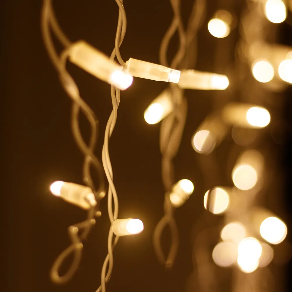 Светодиодная бахрома Pro. Размер 5600x900 мм (длина 5600 мм, по длине 48 нитей высотой 200/900 мм). Количество светодиодов 240 шт размером 7 мм. Цвет свечения ТЕПЛЫЙ БЕЛЫЙ (3000 К), эффект постоянного свечения с мягким световым рисунком (выпуклая молочно-белая линза). Провод белый, резиновый. Питание 230 В, Мощность 15 Вт, защита IP65, применение на улице под навесом. Аксессуары для подключения приобретаются отдельно.