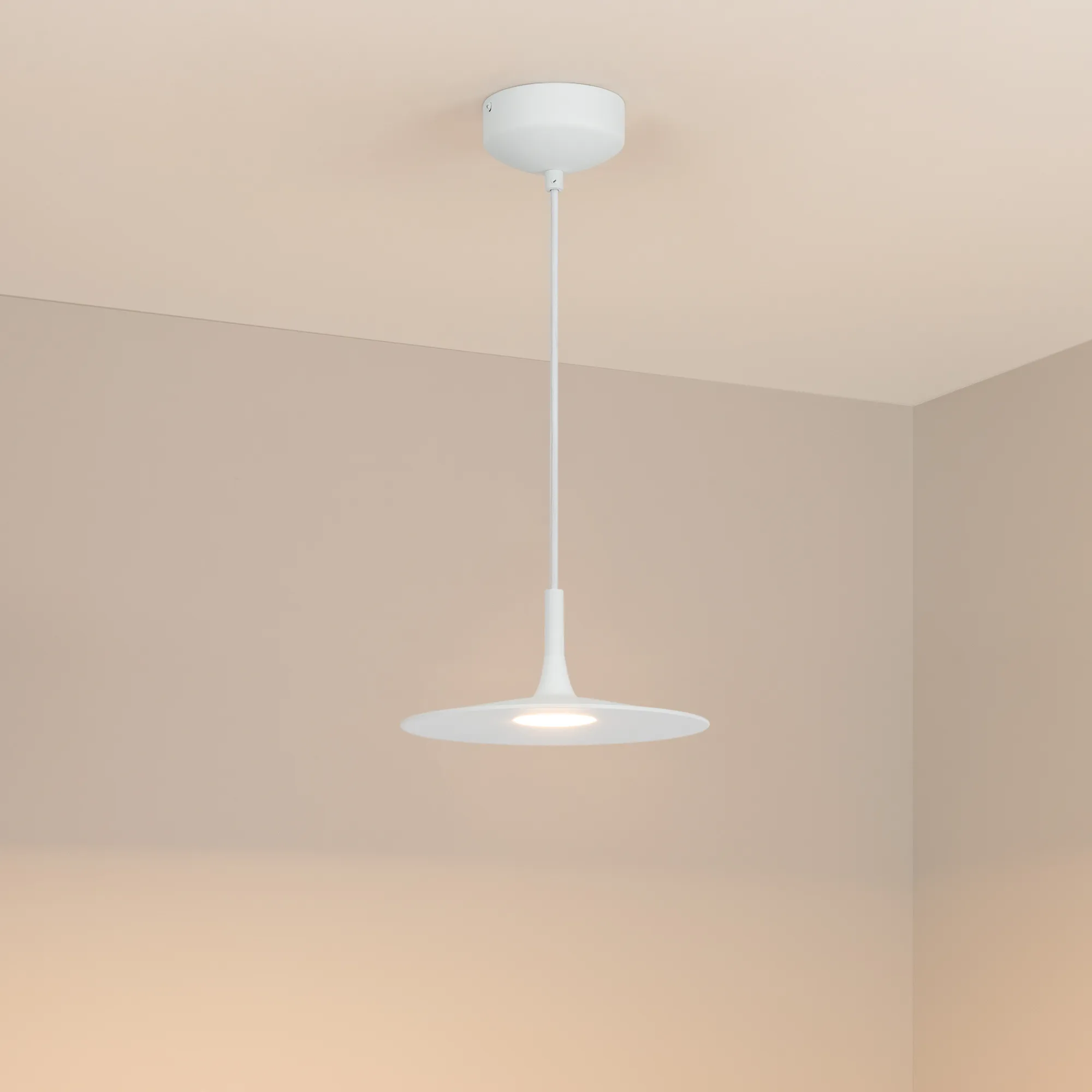 Подвесной светильник. Мощность 8 Вт, св. поток 525 лм, 70 лм/Вт, теплый 3000 K, CRI>90, угол 120°, напряжение питания 230 В. Белый круглый корпус из алюминия, рассеиватель каленое матовое стекло , степень защиты IP20. Размер: диаметр 250 мм, высота основания 64 мм, общая высота 108 мм. Монтаж подвесной, длина подвеса 1500 мм, регулируемая. Габариты чаши Ø120x75 мм. Драйвер 14-24 В, 300 мА, пульсация <5%.