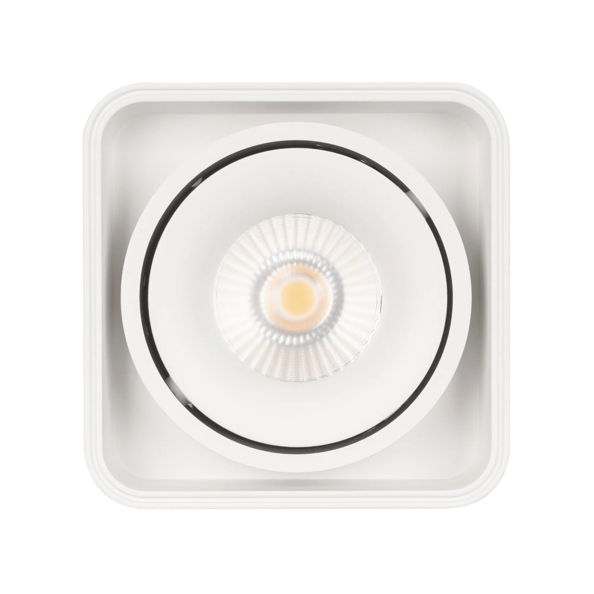 Накладной интерьерный светильник. Мощность 8 Вт, св. поток 760 лм, 98 лм/Вт, теплый 3000 K, CRI>90, угол 45°, регулируемое направление луча 30°, напряжение питания 230 В. Белый квадратный корпус из алюминия, степень защиты IP20. Размер: длина 100 мм, ширина 100 мм, высота 100 мм. Монтаж накладной. Драйвер 24-42 В, 200 мА, пульсация <1%.