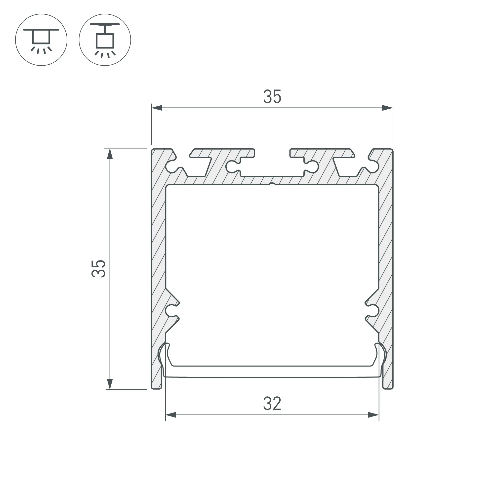 Алюминиевый профиль для светодиодных лент и линеек. Цвет - черный RAL9005 (порошковая окраска). Габаритные размеры (L×W×H): 3000x35x35 мм. Ширина площадки для ленты 31 мм. Экраны, заглушки и другие аксессуары приобретаются отдельно. Цена за 1 метр.