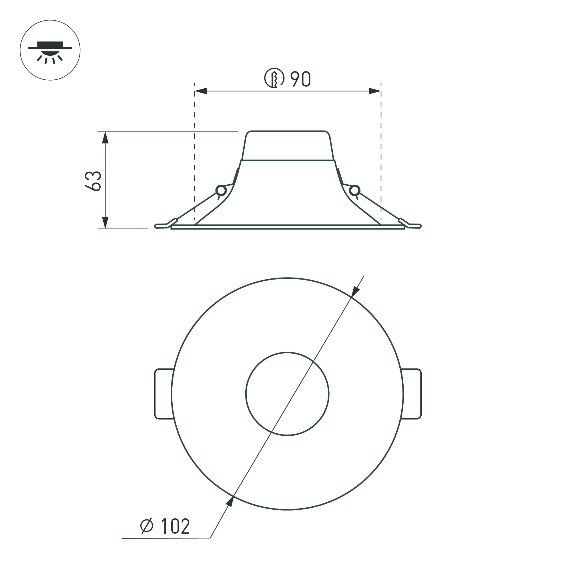Встраиваемый светильник даунлайт с интегрированным в корпус драйвером. Мощность 7.6 Вт, св. поток 505 лм, 66 лм/Вт, тёплый 3000 K, CRI>90, угол 100°, напряжение питания 230 В. Черный круглый корпус из алюминия, степень защиты IP20. Размер: диаметр 102 мм, высота 63 мм. Монтаж встраиваемый, установочное отверстие: диаметр 90 мм. Пульсация <3%.