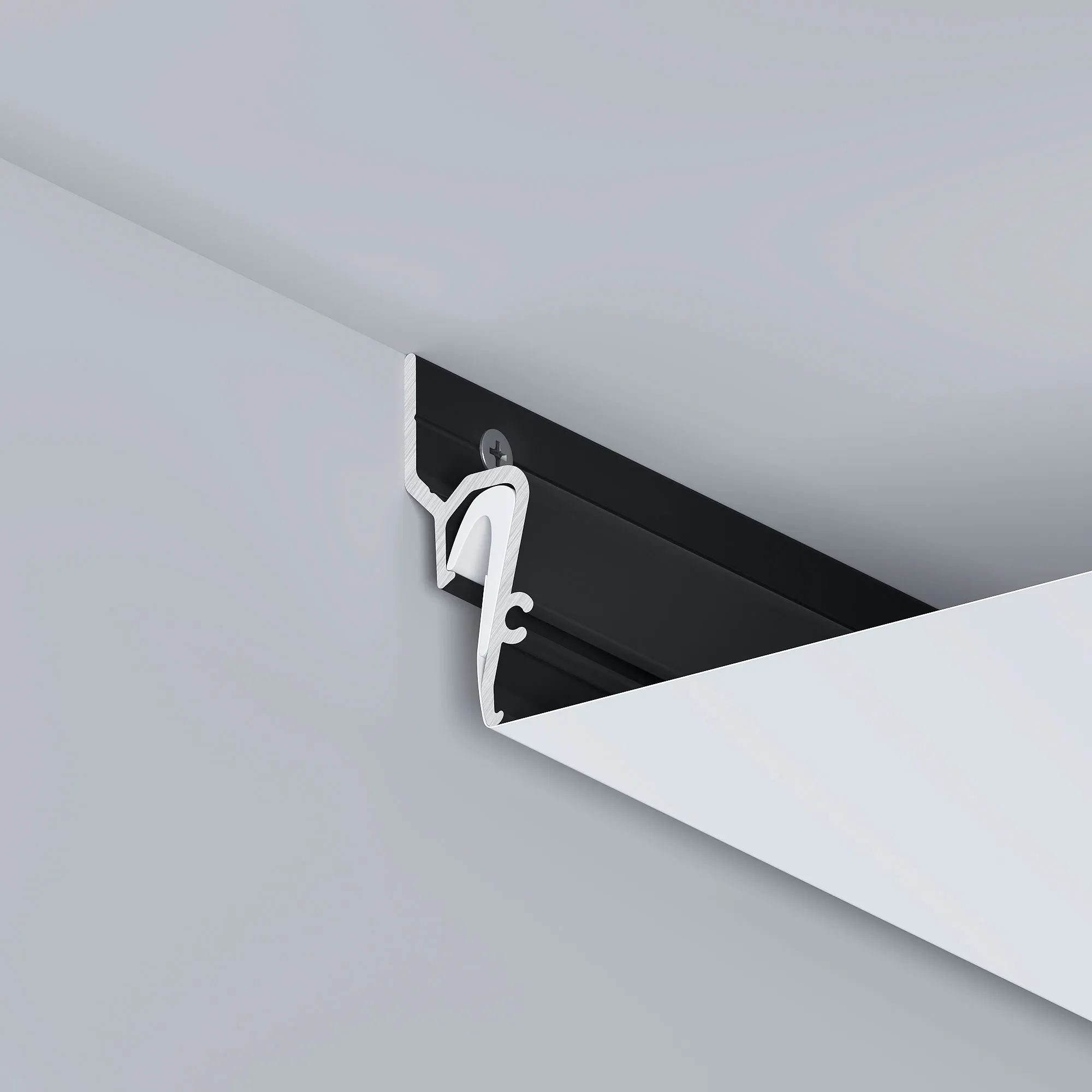 Алюминиевый профиль для монтажа натяжного потолка с теневым зазором 8мм. Цвет - черный RAL9005 (порошковая окраска). Гарпунная система монтажа. Габаритные размеры (L×W×H): 2000x14x37мм. Цена за 1 метр.