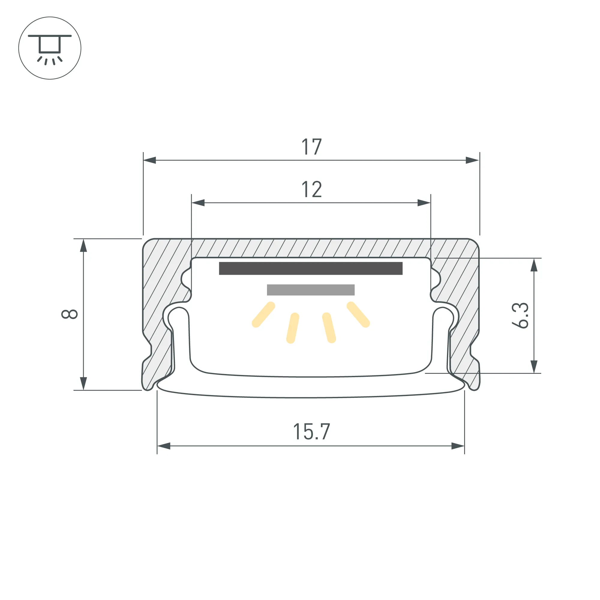 Алюминиевый анодированный накладной профиль для светодиодных лент и линеек. Цвет - золотой. Габаритные размеры (L×W×H): 2000x17x8 мм. Ширина площадки для ленты 12 мм. Экраны, заглушки и другие аксессуары приобретаются отдельно. Цена за 1 метр.