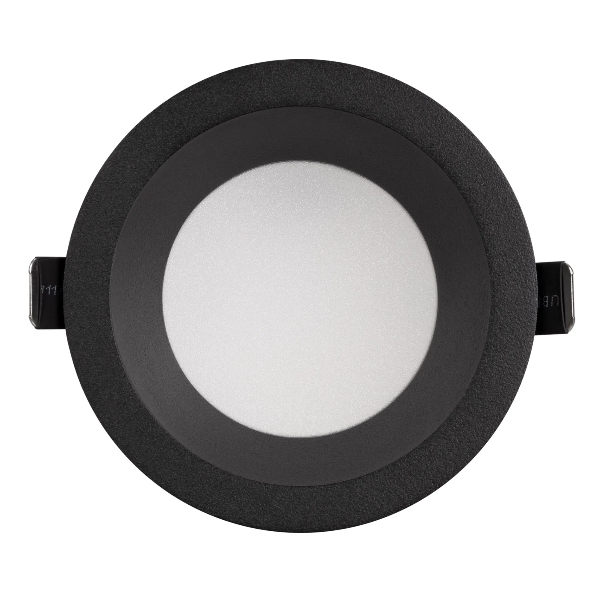 Встраиваемый светильник даунлайт. Мощность 14 Вт, св. поток 1170 лм, 83 лм/Вт, тёплый 3000 K, CRI>90, угол 85°, напряжение питания 230 В. Чёрный круглый корпус из алюминия, степень защиты IP54. Размер: диаметр 105 мм, высота 58 мм. Монтаж встраиваемый, установочное отверстие: диаметр 95 мм. Драйвер IP54, 26-42 В, 350 мА, пульсация <2%.