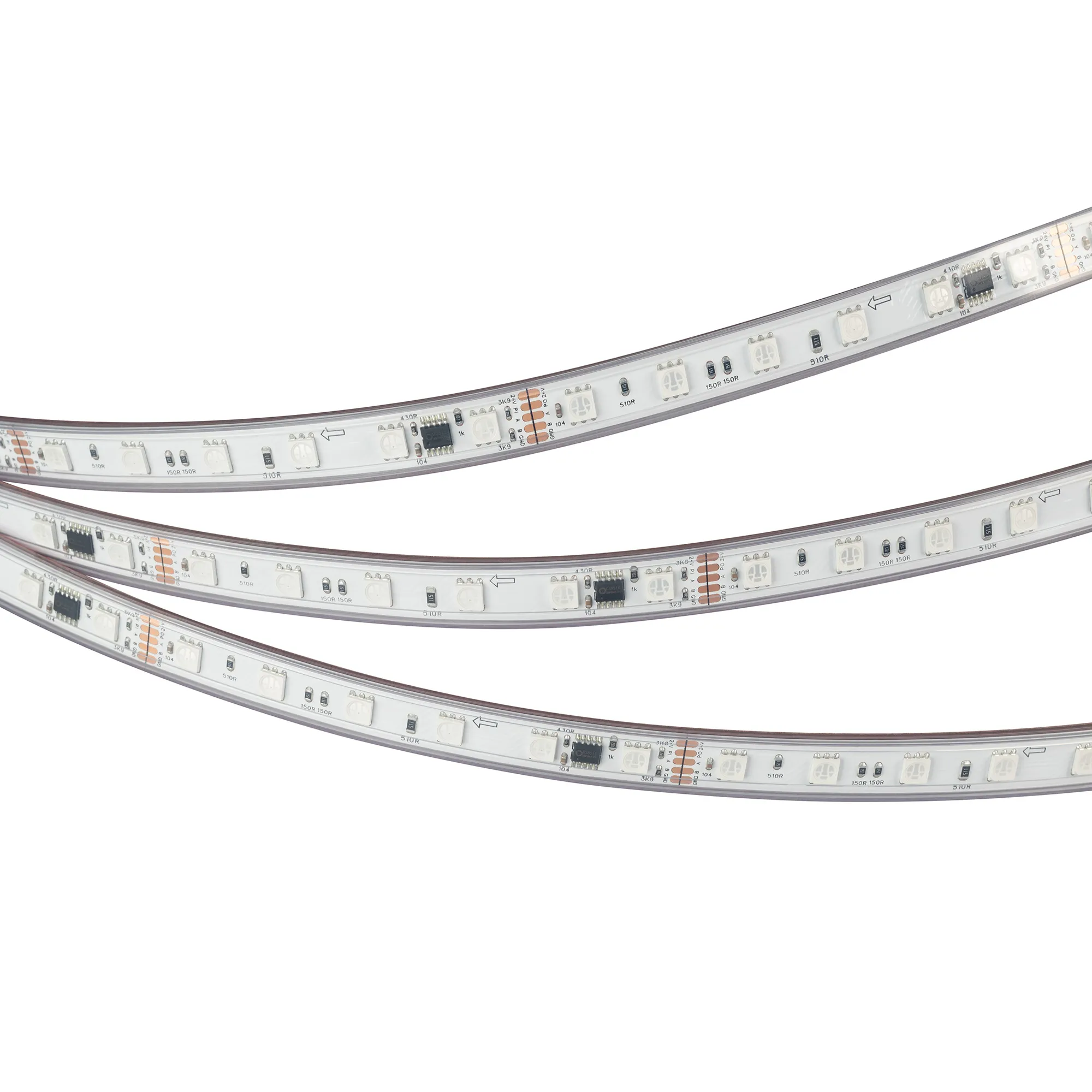 Светодиодная герметичная лента DMX серии B60 с микросхемой GS8526, IP67 (PS - силиконовая экструзия). Светодиоды SMD 5060, 60 шт/м, 10 pixels на 1 м (50 pixels на 5 м), 1 pixel = 6 светодиодов, белая плата шириной 10 мм, скотч 3М. Цвет RGB, угол 120°. Питание 24 В, мощность 14 Вт/м (70 Вт на 5 м). Размеры 5000x12x5 мм. Мин. отрезок 100 мм, 6 светодиодов. Цена за 1 м.