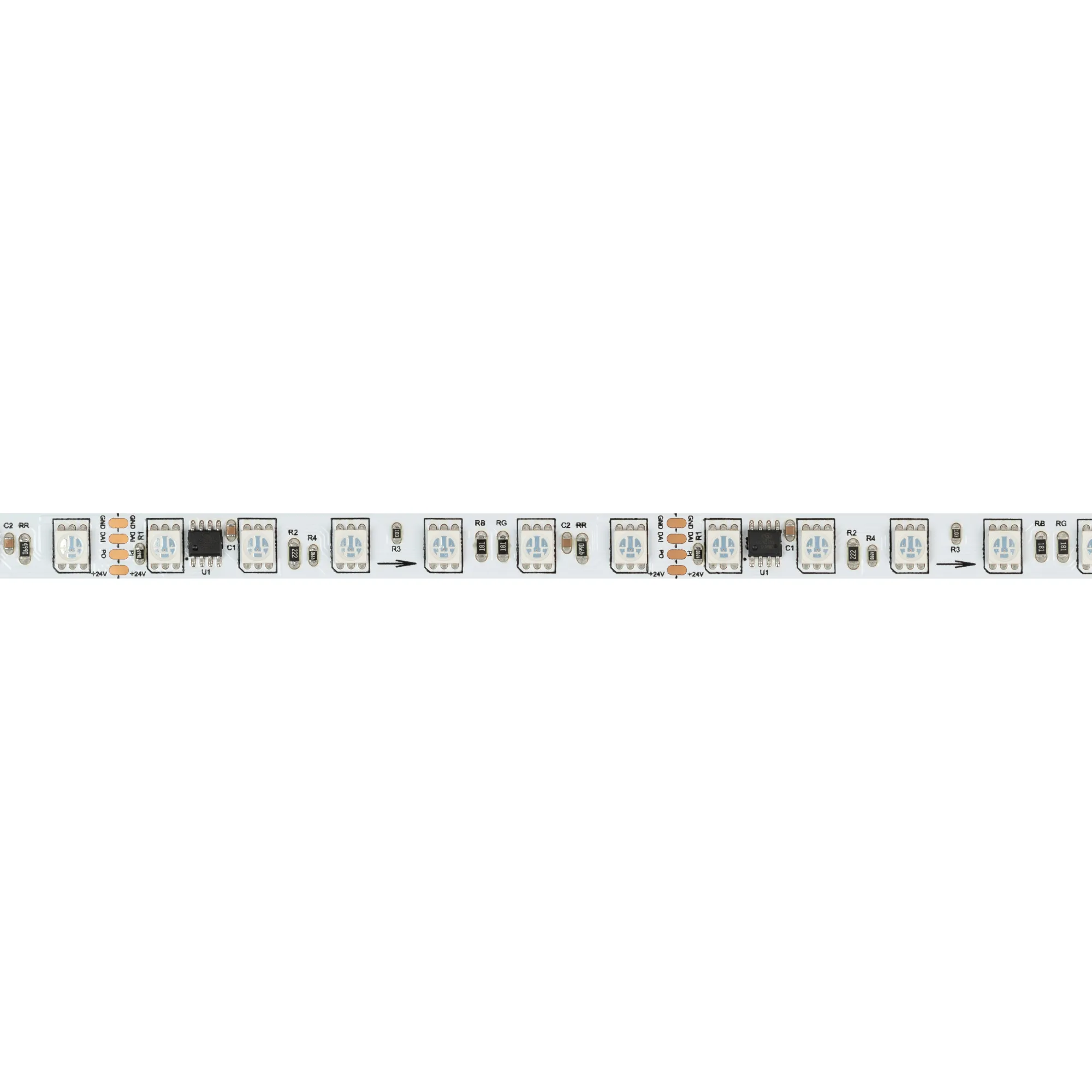 Светодиодная лента DMX серии B72 с микросхемой UCS512. Светодиоды SMD 5060, 72шт/м, 12 pixels на 1 м (60 pixels на 5 м), 1 pixel = 6 светодиодов, белая плата шириной 10 мм, скотч 3М. Цвет RGB, угол 120°. Питание 24 В, мощность 16 Вт/м (80 Вт на 5 м). Размеры 5000x10x2 мм. Мин.отрезок 83.33 мм, 6 светодиодов. Цена за 1м.