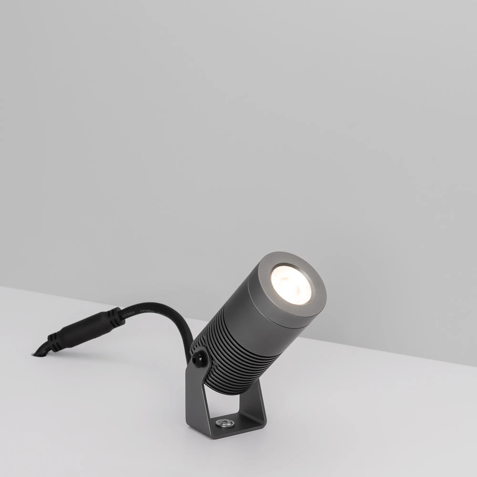 Уличный светодиодный прожектор, мощность 8Вт, угол освещения 33°. Цвет ТЕПЛЫЙ 3000К, световой поток 580лм. Влагозащищенный корпус IP67 - темно-серый алюминий, экран из закалённого стекла. Угол поворота корпуса в вертикальной плоскости 135°. Питание 230В, мощность 8 Вт. Размеры DxH -Ø44х90мм. В комплекте 1м провод.