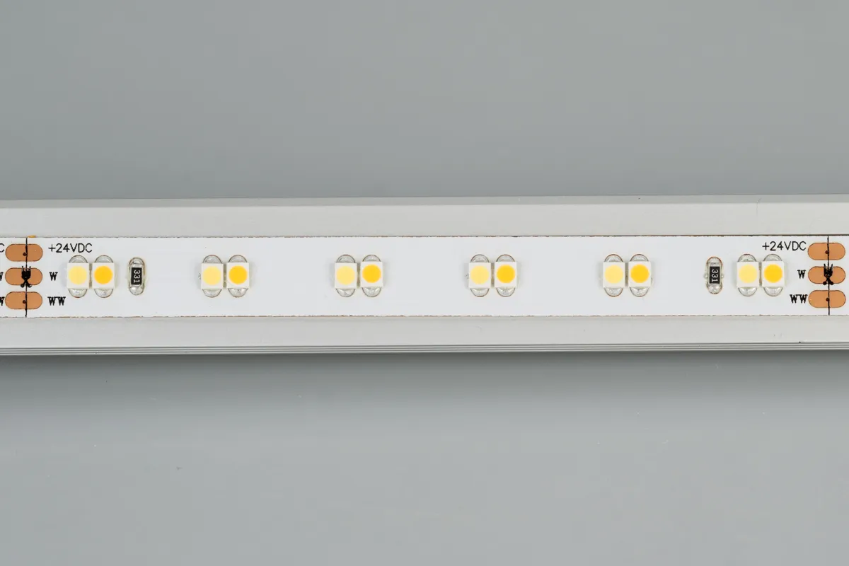 2-х канальная лента LUX с изменяемой цв.температурой, светодиоды smd 3528, 120шт/м (600шт на 5м), белая плата 10мм, скотч 3М. Два цвета БЕЛЫЙ 6500K + ТЁПЛЫЙ 2700K. Угол 120°, цветопередача CRI>90. Питание 24V, мощность 9,6 Вт/м (48 Вт на 5м). Размеры 5000х10х1,8мм. Мин.отрезок 100мм, 12 светодиодов. Цена за 1м.