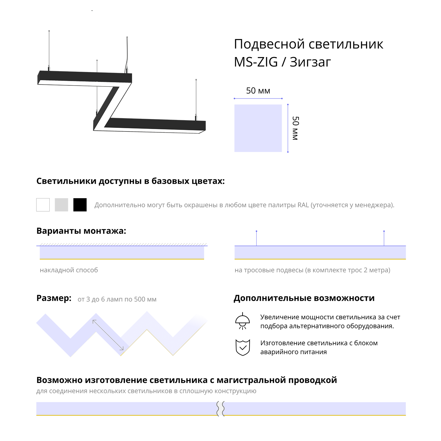 Cветодиодный фигурный светильник MS-ZIG Зигзаг размер профиля 50x50мм длиной 6х500мм мощностью 60W. Светильник собирается из алюминиевого основния с матовым рассеивателем, который дает равномерную засветку по всей площади.