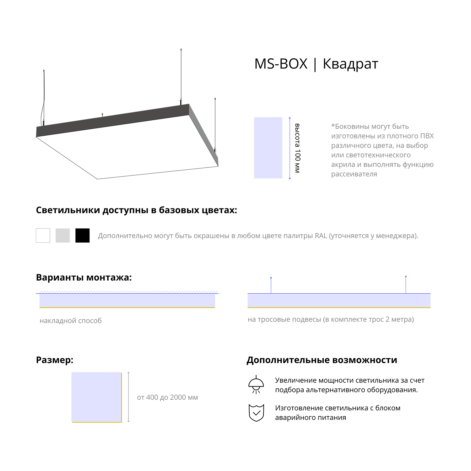 - Варианты монтажа: на тросовые подвесы (в комплекте трос 2 метра) и накладным способом.
