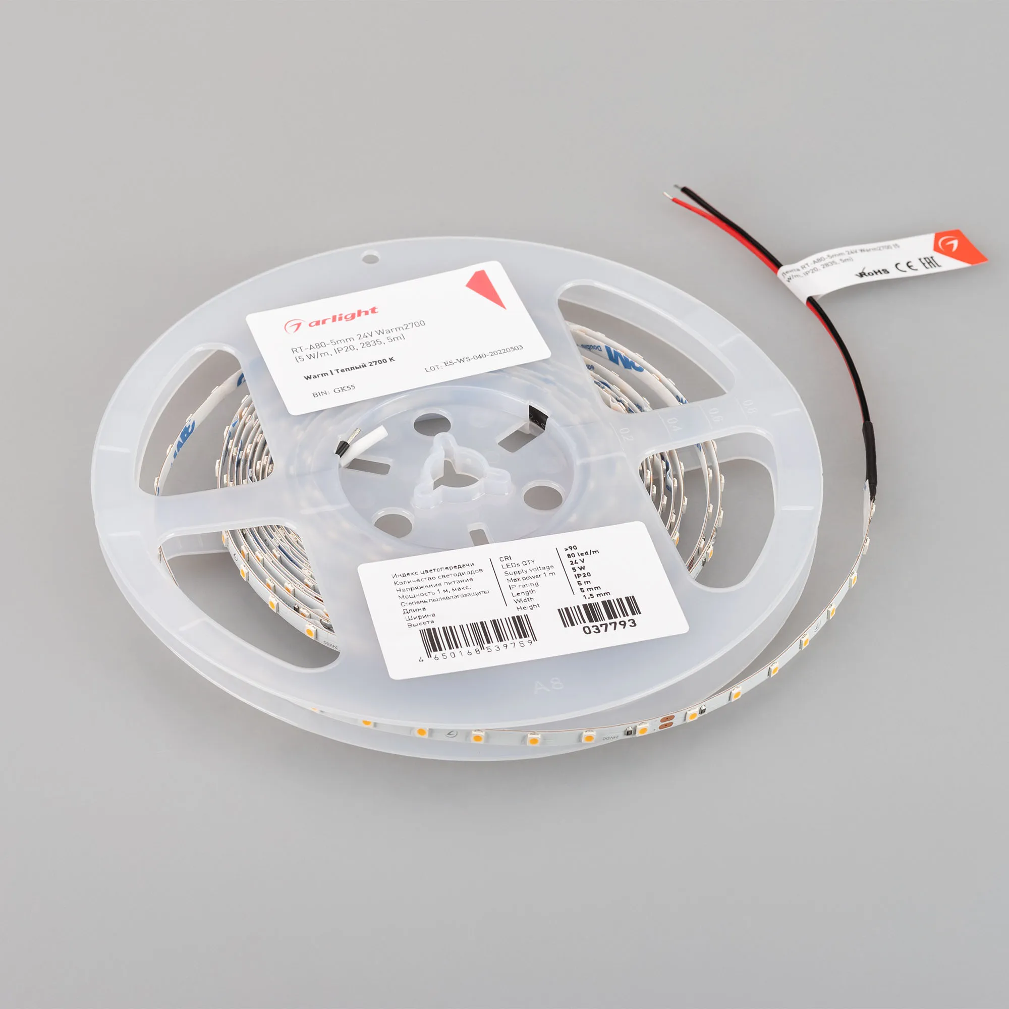 Светодиодная узкая лента RT серии A80. Светодиоды SMD 2835, 80 шт/м, белая плата шириной 5 мм, скотч 3M. Цвет ТЕПЛЫЙ 2700K, индекс цветопередачи CRI>90, угол 120°. Питание 24 В, мощность 5 Вт/м (25 Вт на 5 м). Размеры 5000х5х1.5 мм. Мин. отрезок 100 мм, 8 светодиодов. Цена за 1 м. Рекомендуется установка на профиль.